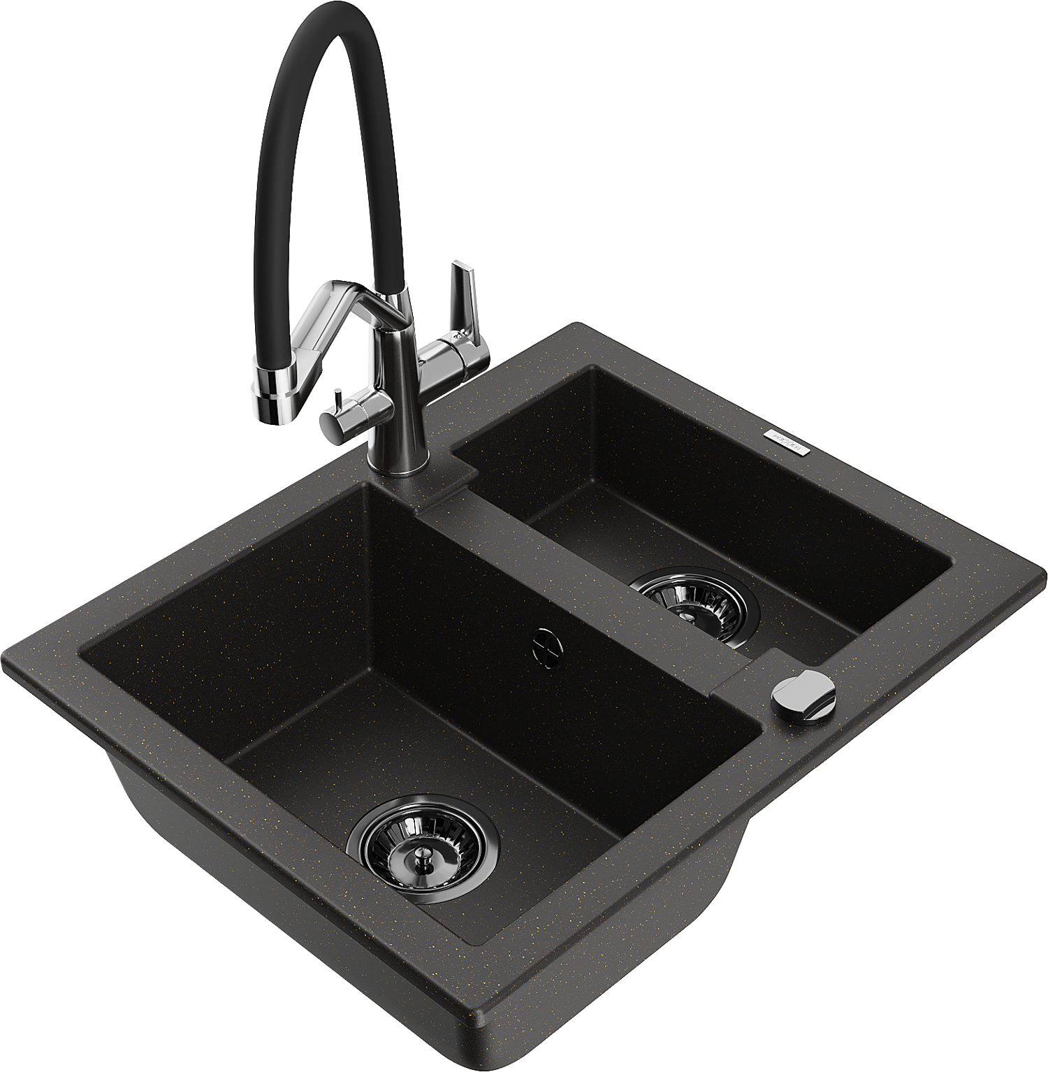 Mexen Carlos žulový kuchynský drez 1,5-komorový s kuchynskou batériou Duo, čierny/zlatý metalický - 6518-75-671701-07-B