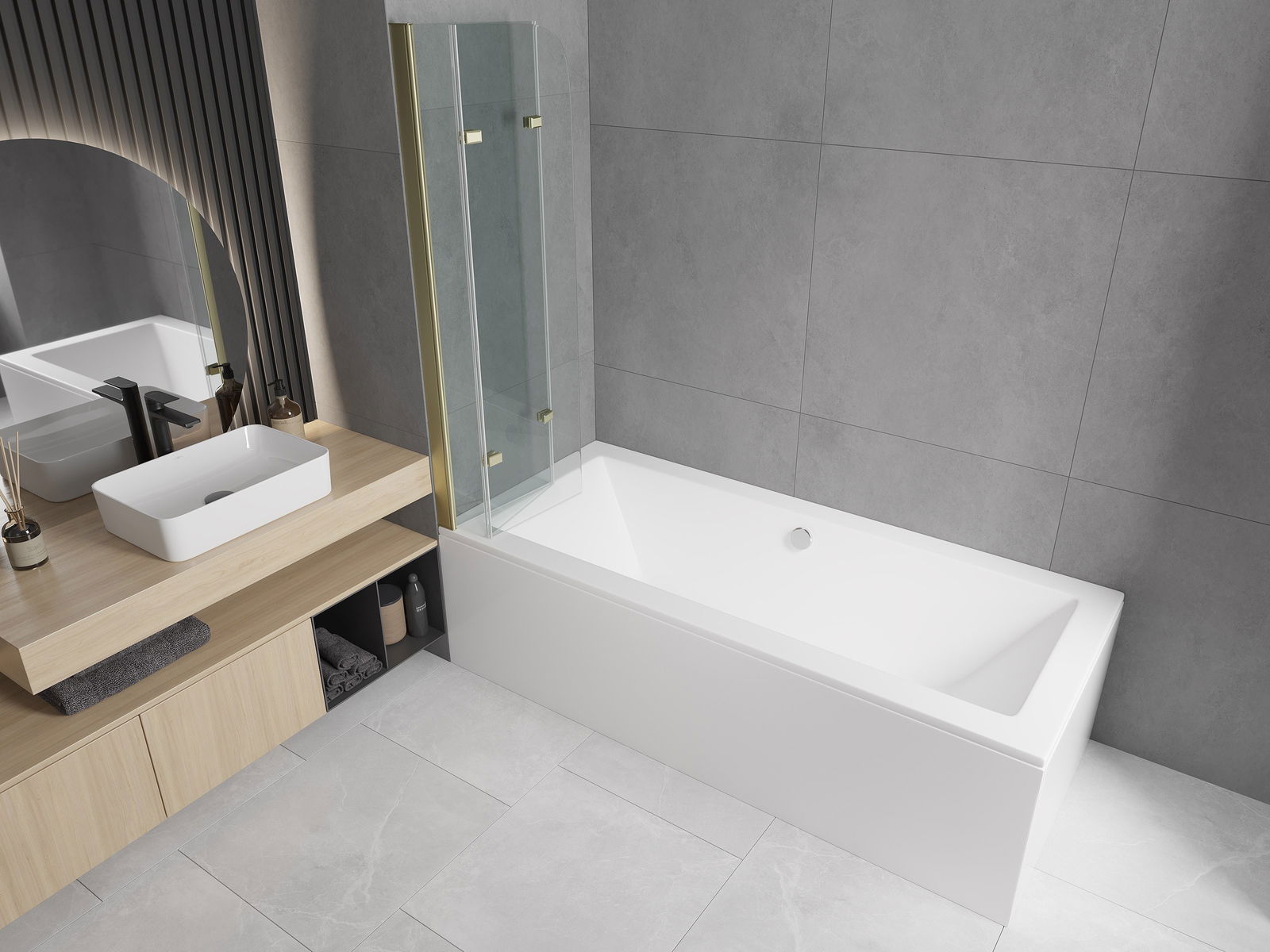 Paraván vyrobený z troch krídel s možnosťou zloženia. Takéto riešenie umožňuje ušetriť viac miesta v kúpeľni a umožňuje voľné využívanie zvyšku priestoru, keď nepoužívame kúpeľnú zónu.