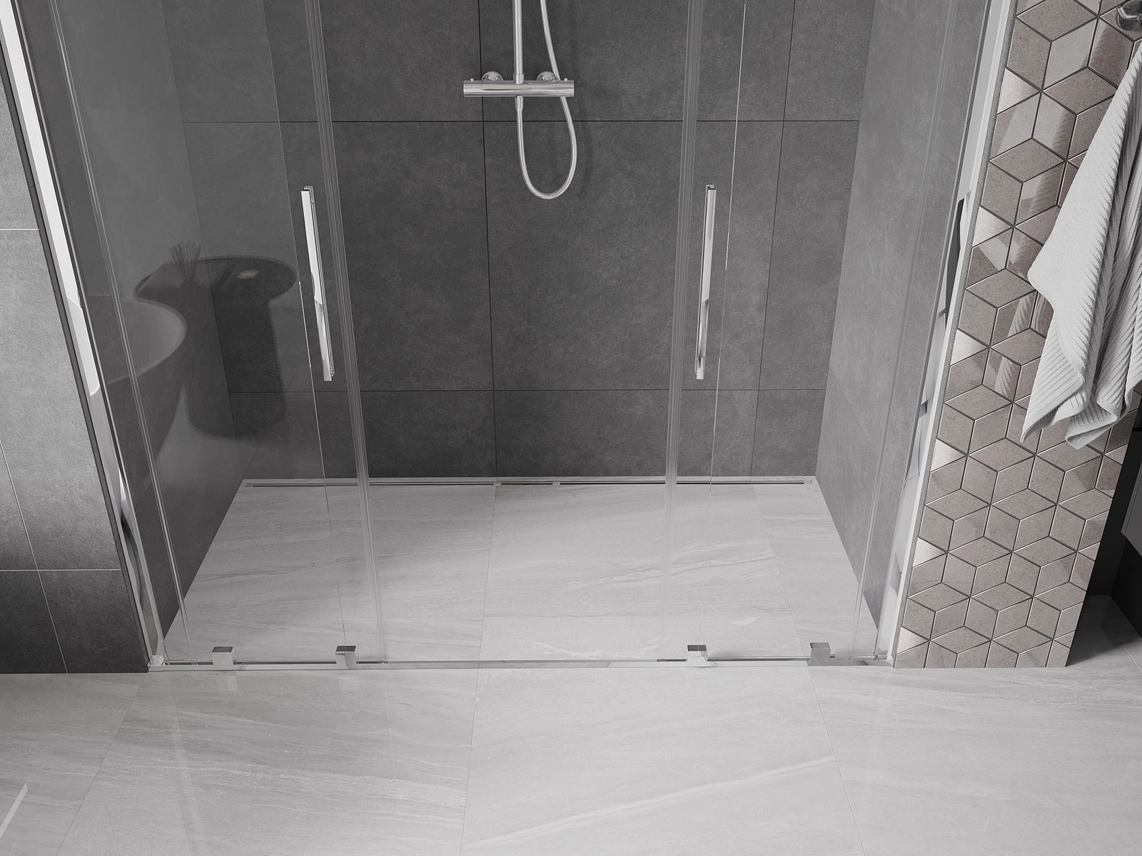Praktická a pohodlná rukoväť je vyrobená z nehrdzavejúcej ocele. Módny tvar v kombinácii s povrchovou úpravou, ktorá ladí s farbou profilov, dodáva celku moderný a štýlový vzhľad, čím zvyšuje estetiku každej kúpeľne.