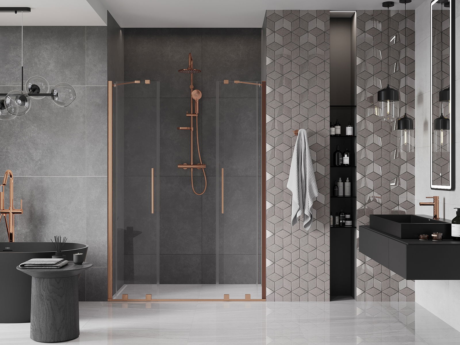 Mexen Velar Duo posuvné sprchové dvere 150 cm, transparentné, brúsená meď - 871-150-000-02-65