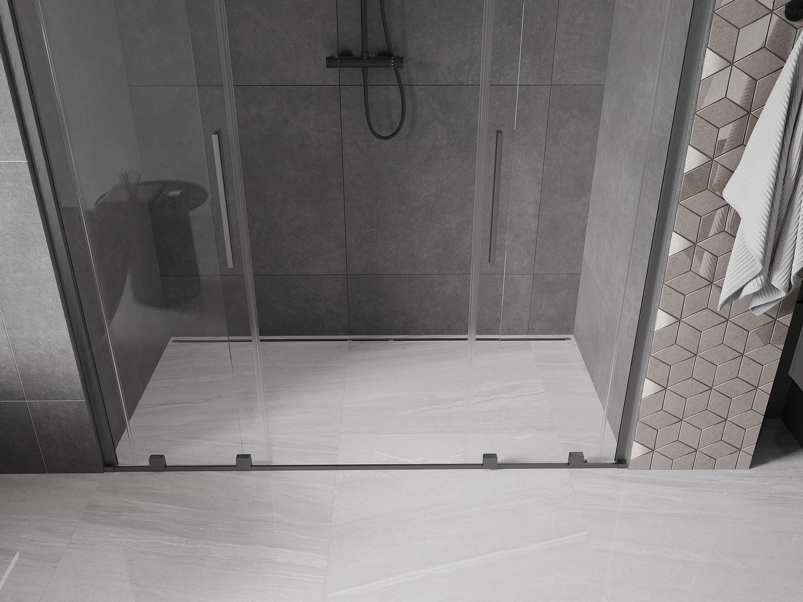 Praktická a pohodlná rukoväť je vyrobená z nehrdzavejúcej ocele. Módny tvar v kombinácii s povrchovou úpravou, ktorá ladí s farbou profilov, dodáva celku moderný a štýlový vzhľad, čím zvyšuje estetiku každej kúpeľne.