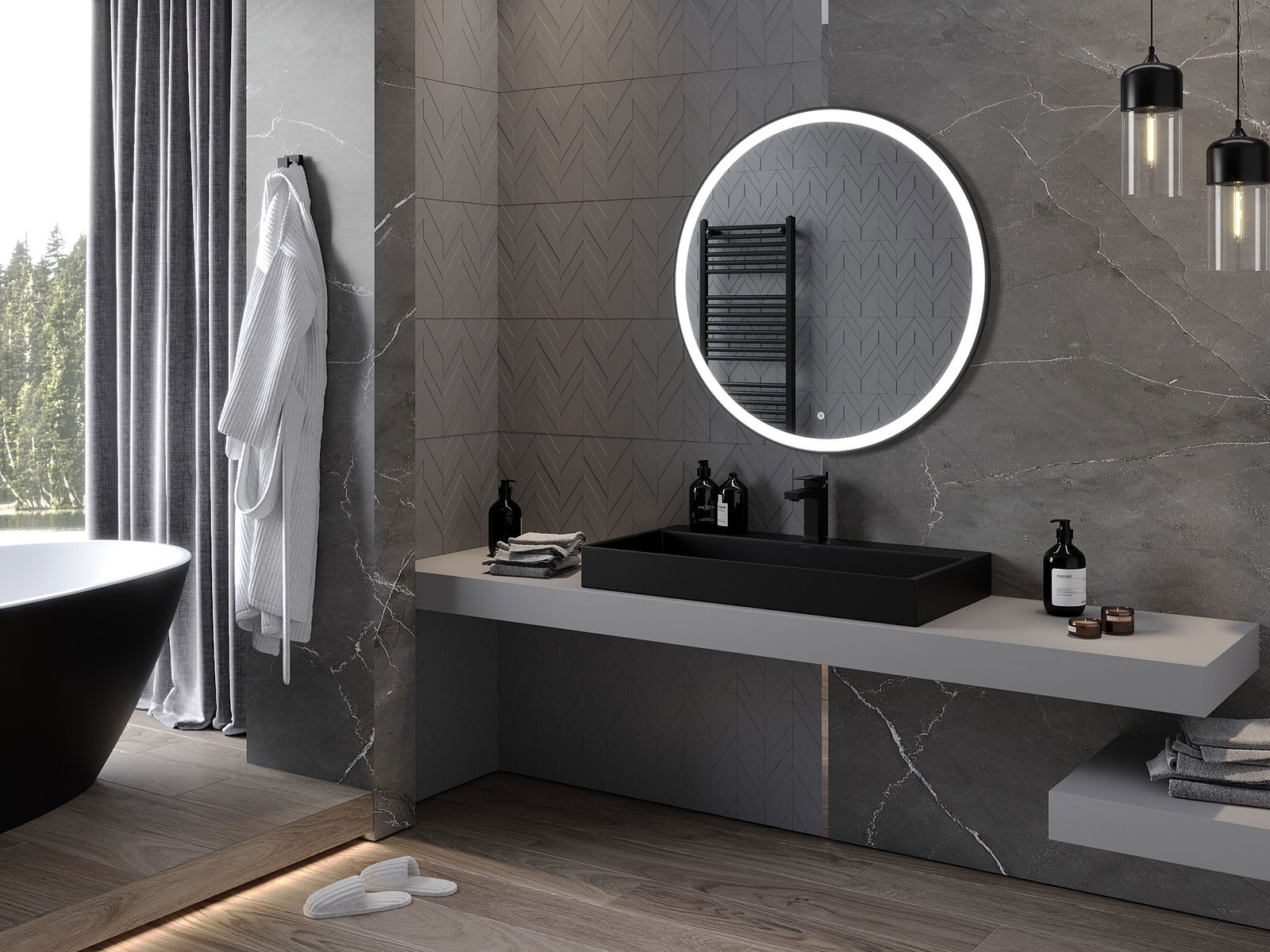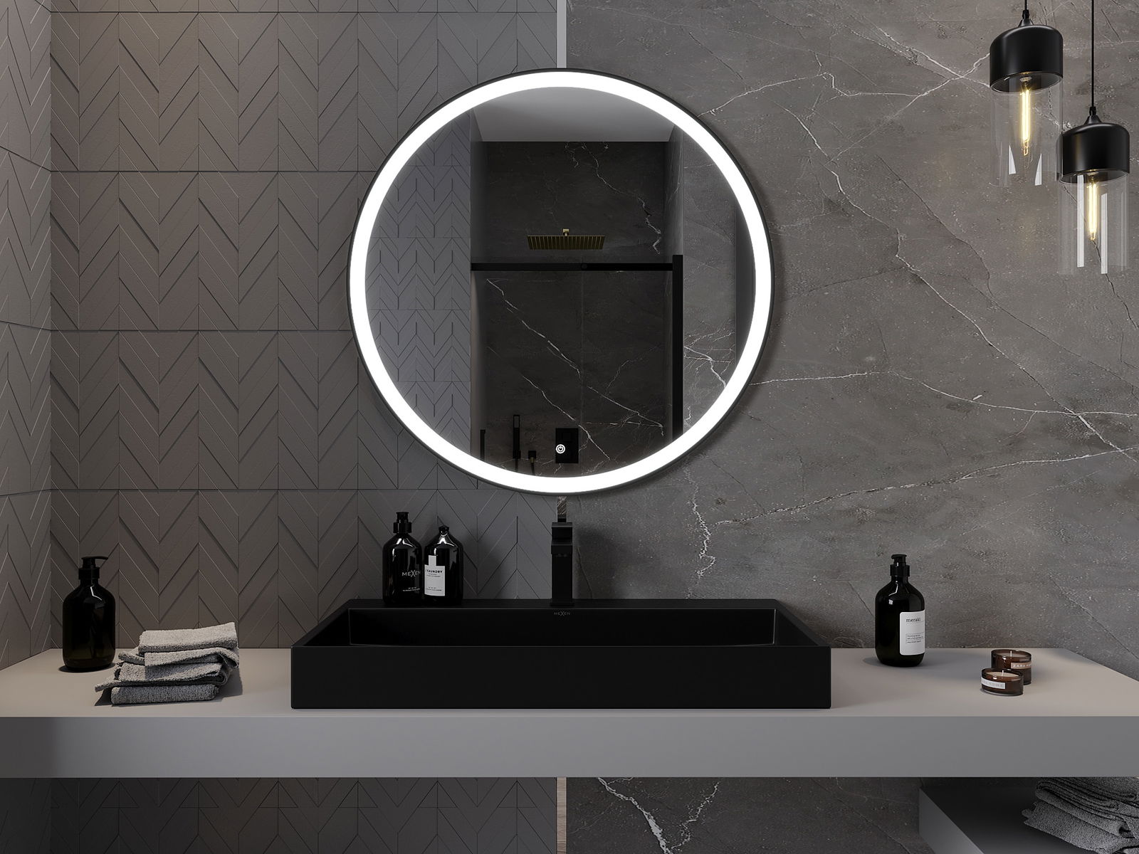 Mexen Esso osvetlené kúpeľňové zrkadlo, okrúhle 90 cm, LED 6000K, proti zahmlievaniu, čierny rám - 9825-090-090-611-70
