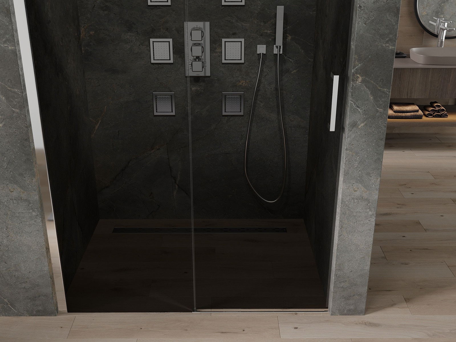 V závislosti od vašich potrieb je možné produkt namontovať na sprchovací podnos aj priamo na podlahe. Univerzálna montážna metóda vám umožňuje prispôsobiť produkt rôznym typom kúpeľní a nakonfigurovať priestor.