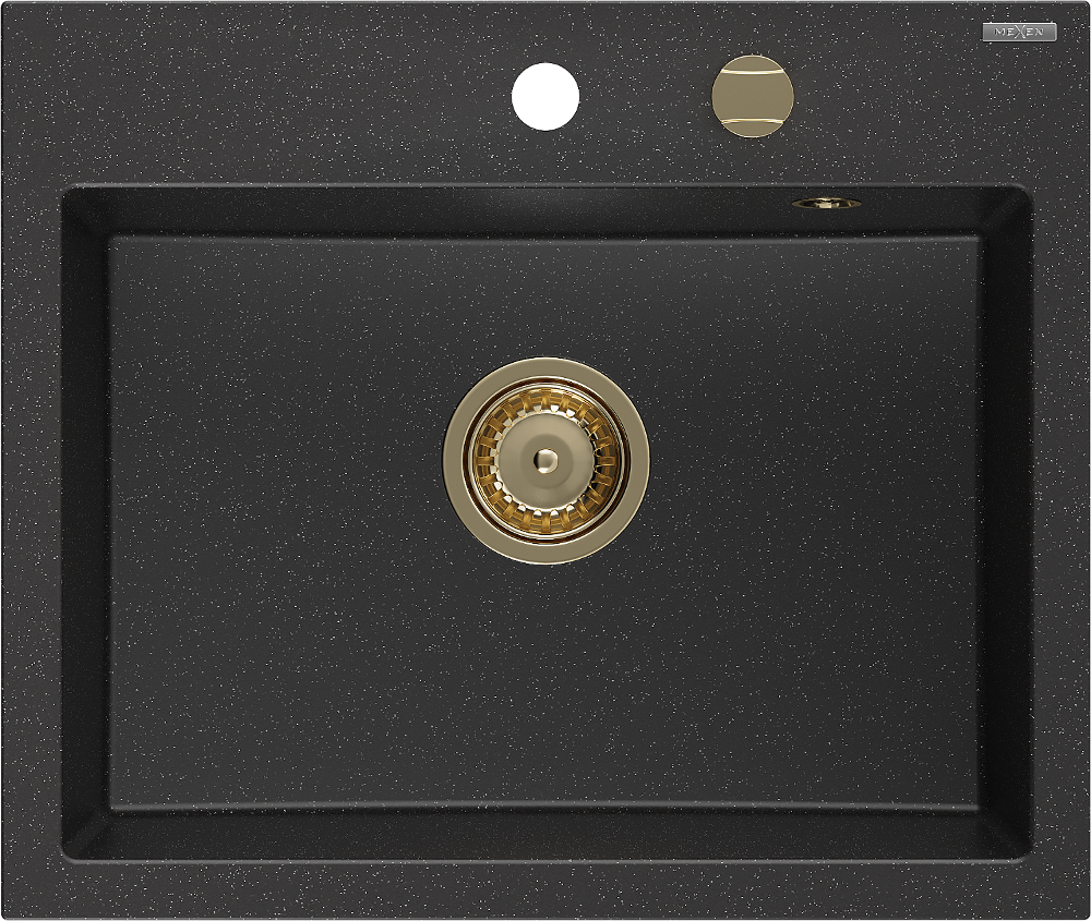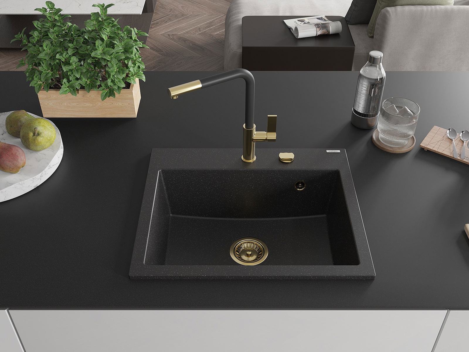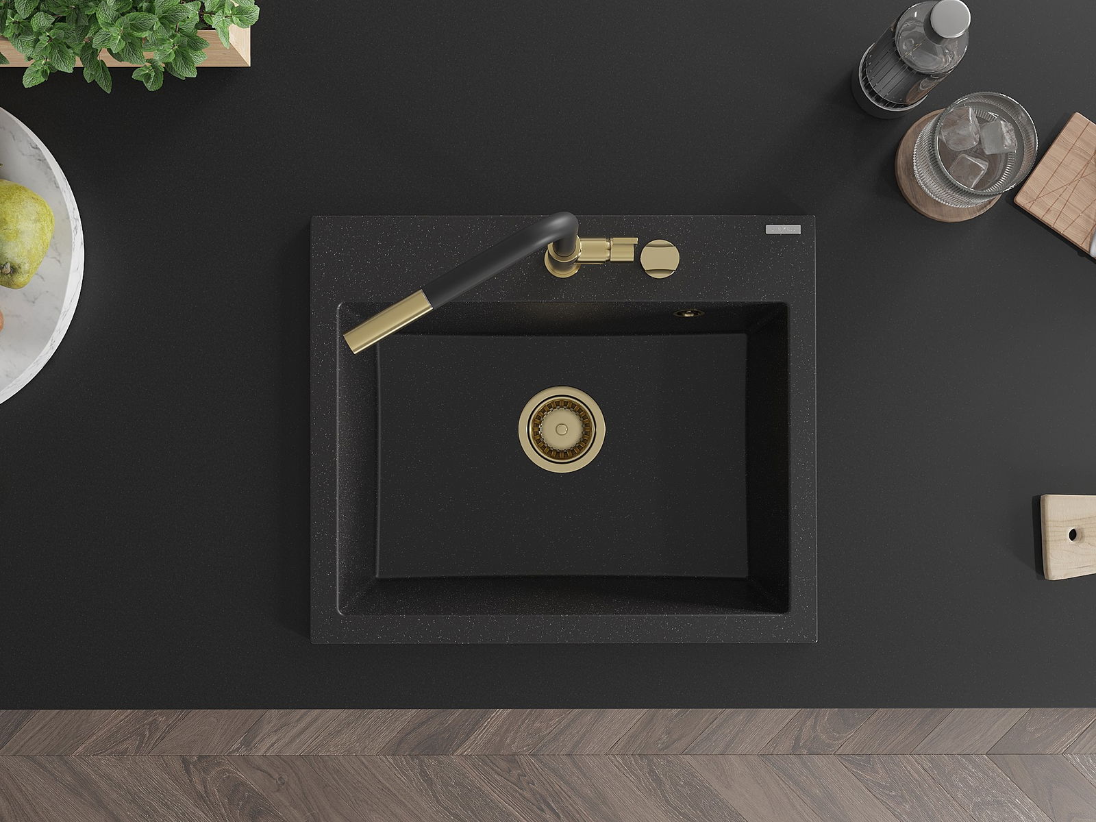 Mexen Oscar žulový kuchynský drez 1-komorový 580 x 490 mm, čierny/strieborný metalický, sifón zlatý - 6519581000-73-G