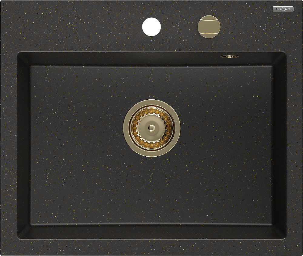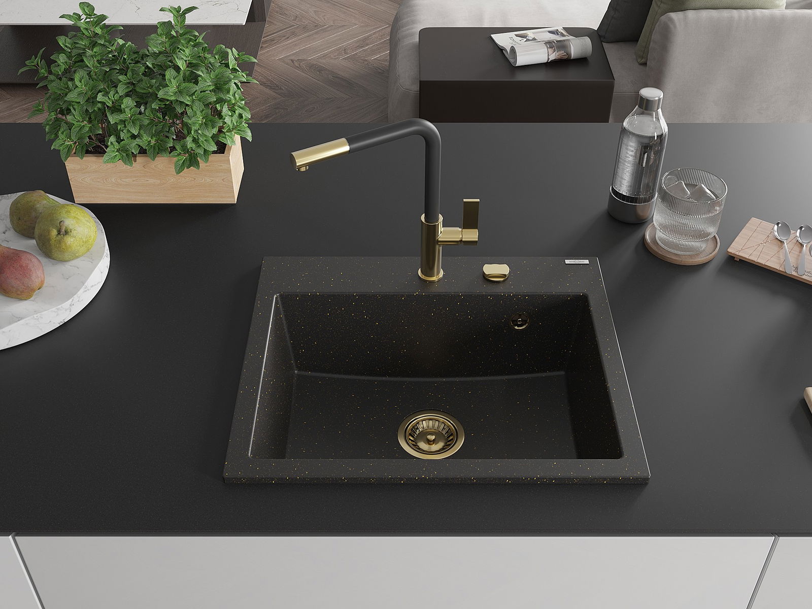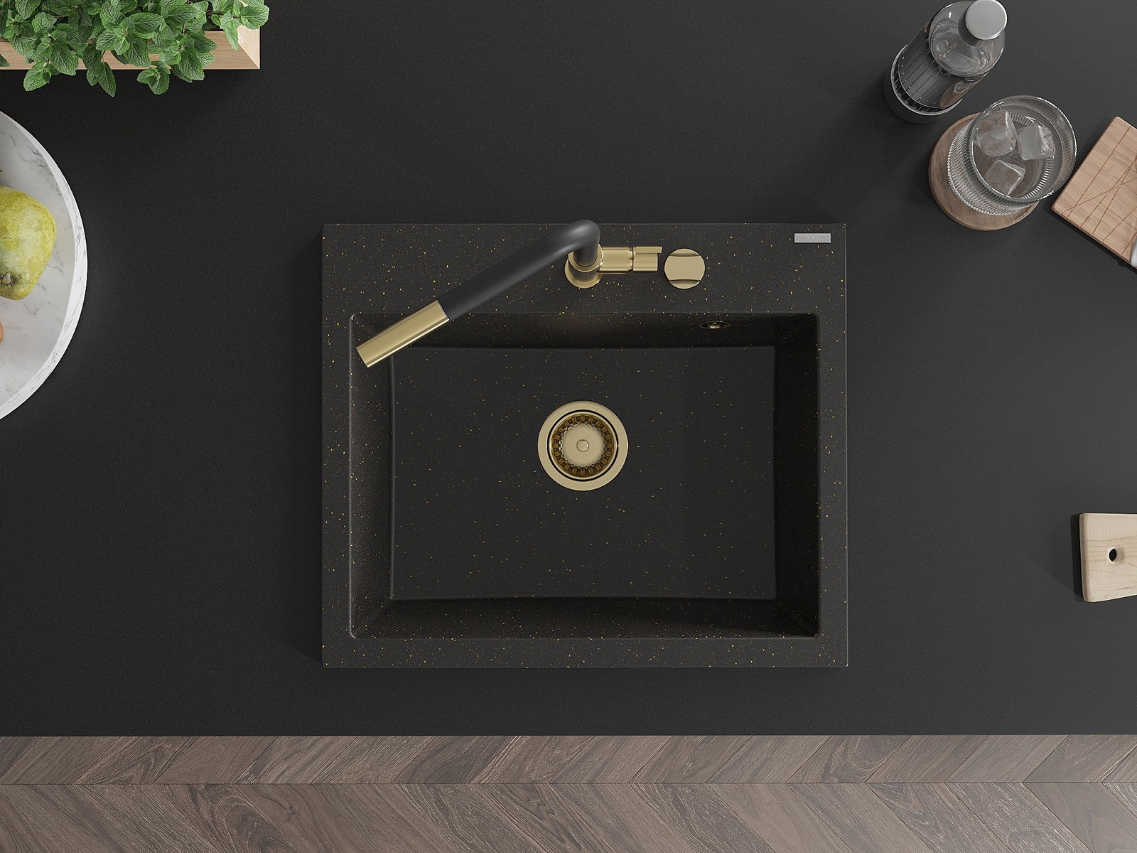 Mexen Oscar granitový drez 1-komorový 580 x 490 mm, čierny/zlatý metalík, sifón zlatý - 6519581000-75-G