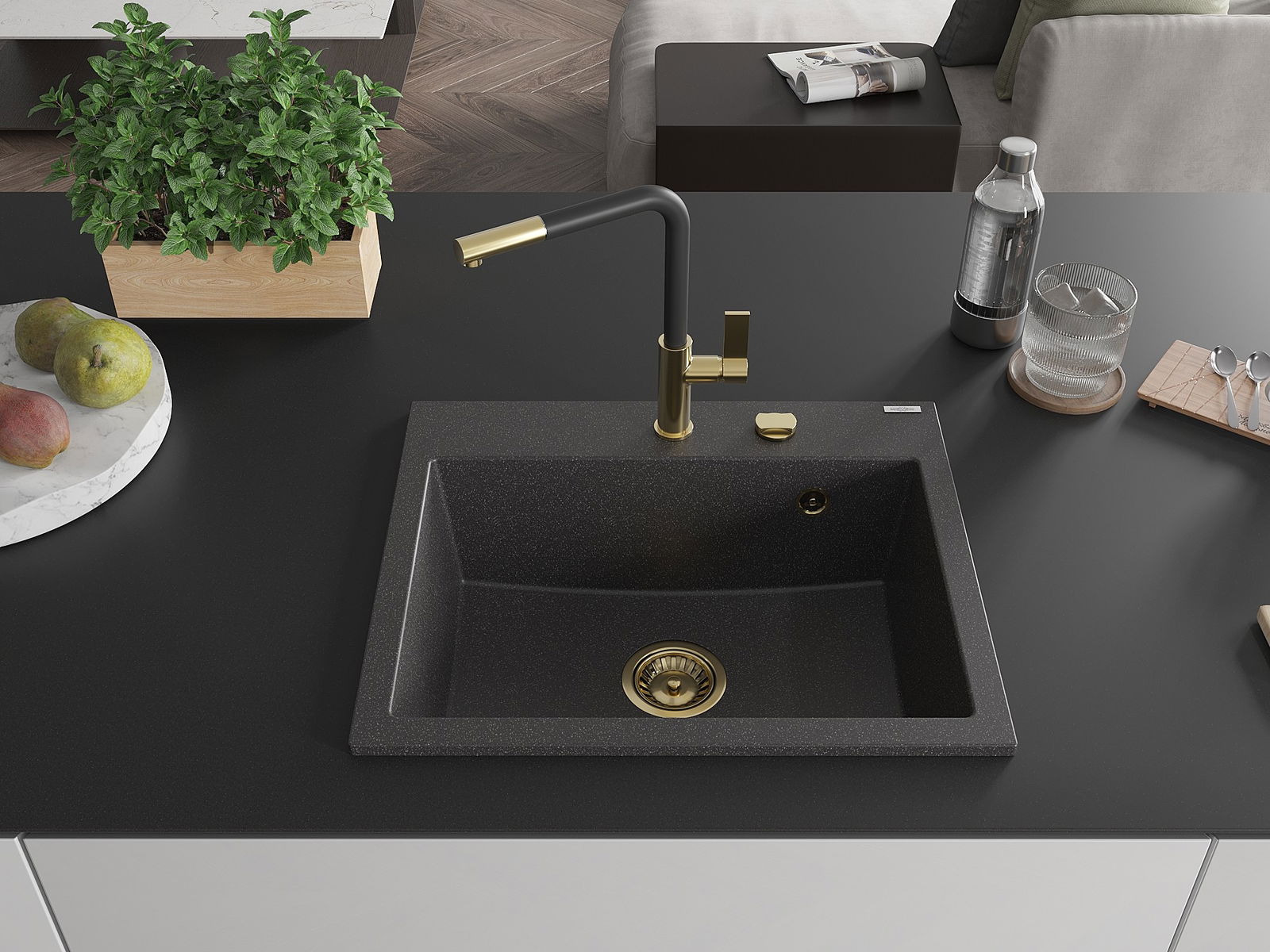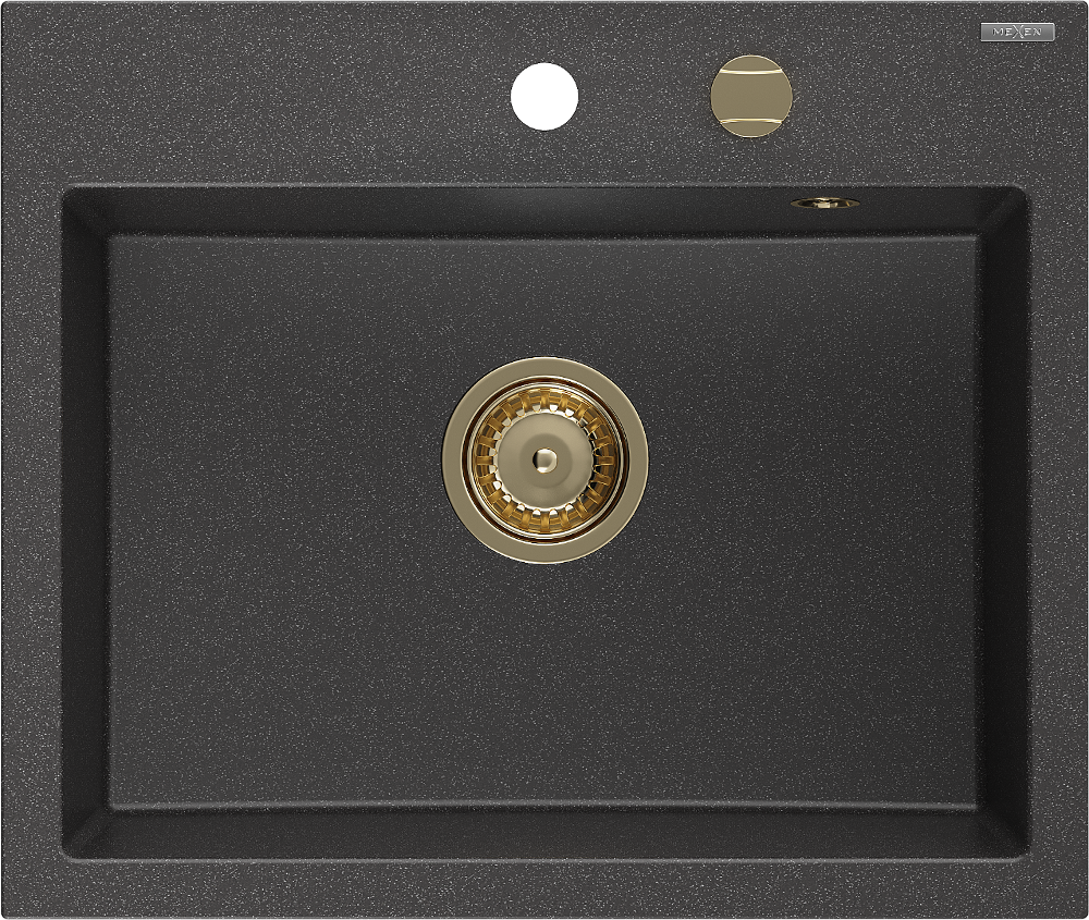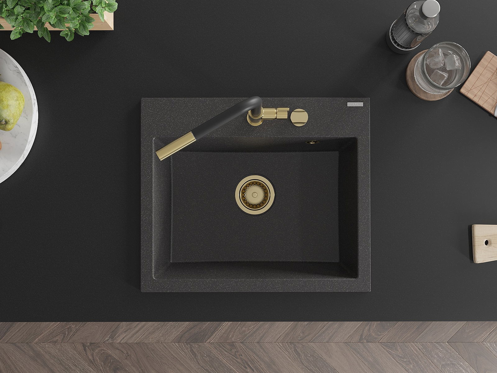 Mexen Oscar granitový drez 1-komorový 580 x 490 mm, čierny s bodkami, sifón zlatý - 6519581000-76-G