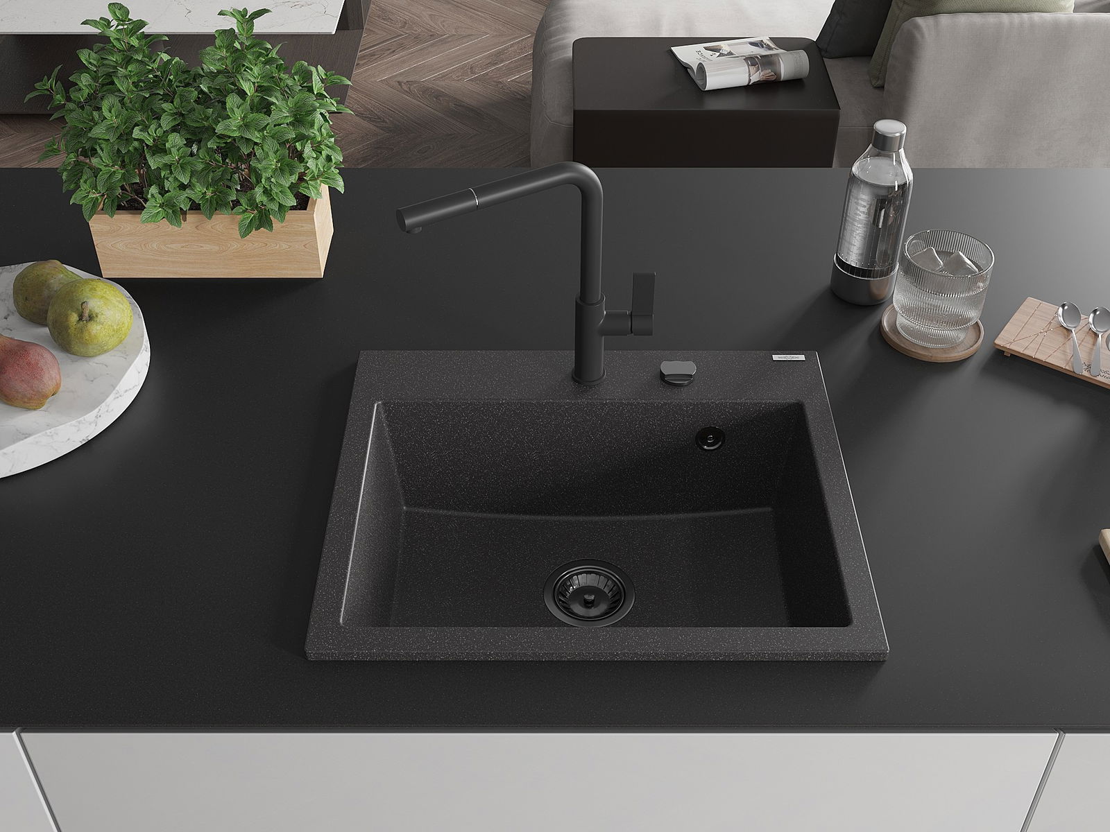 Mexen Oscar žulový drez s jednou komorou 580 x 490 mm, čierny bodkovaný, čierny sifón - 6519581000-76-B