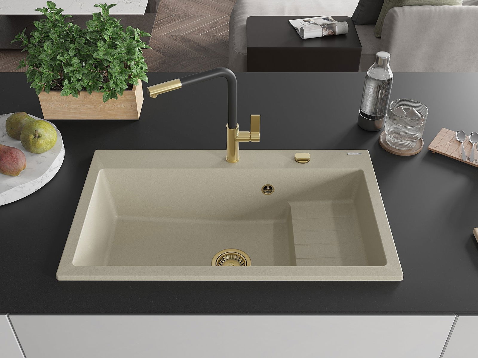 Drez má predfrézovaný otvor s priemerom 35 mm na samostatné prerazenie. Môže sa využiť napríklad na montáž dávkovača na tekutinu, ktorý eliminuje prítomnosť plastových fliaš v kuchyni a pridáva jej elegantné dokončenie.