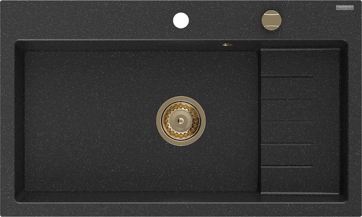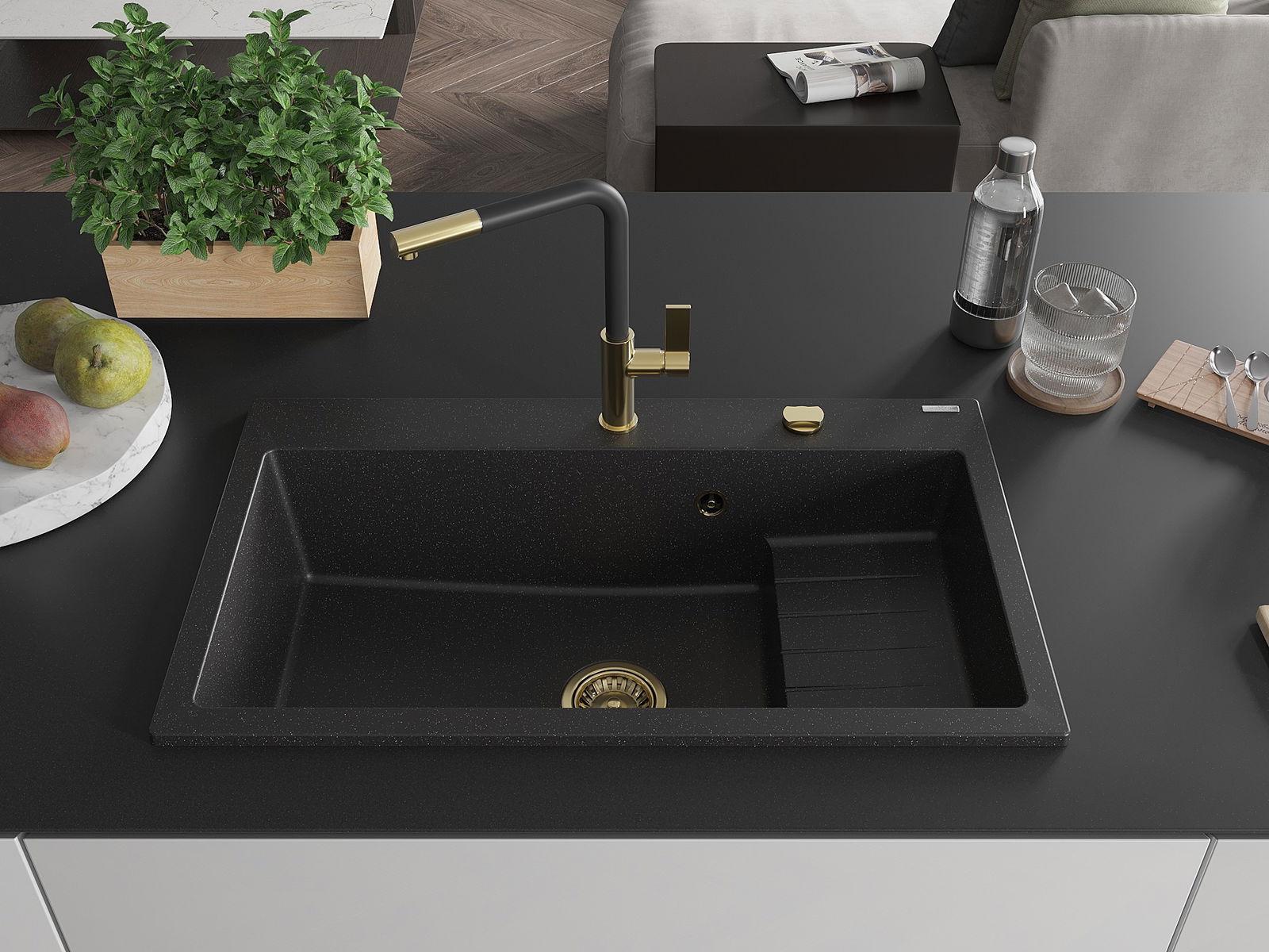 Mexen Omar žulový drez 1-komorový 800 x 480 mm, čierny/strieborný metalický, sifón zlatý - 6520801005-73-G