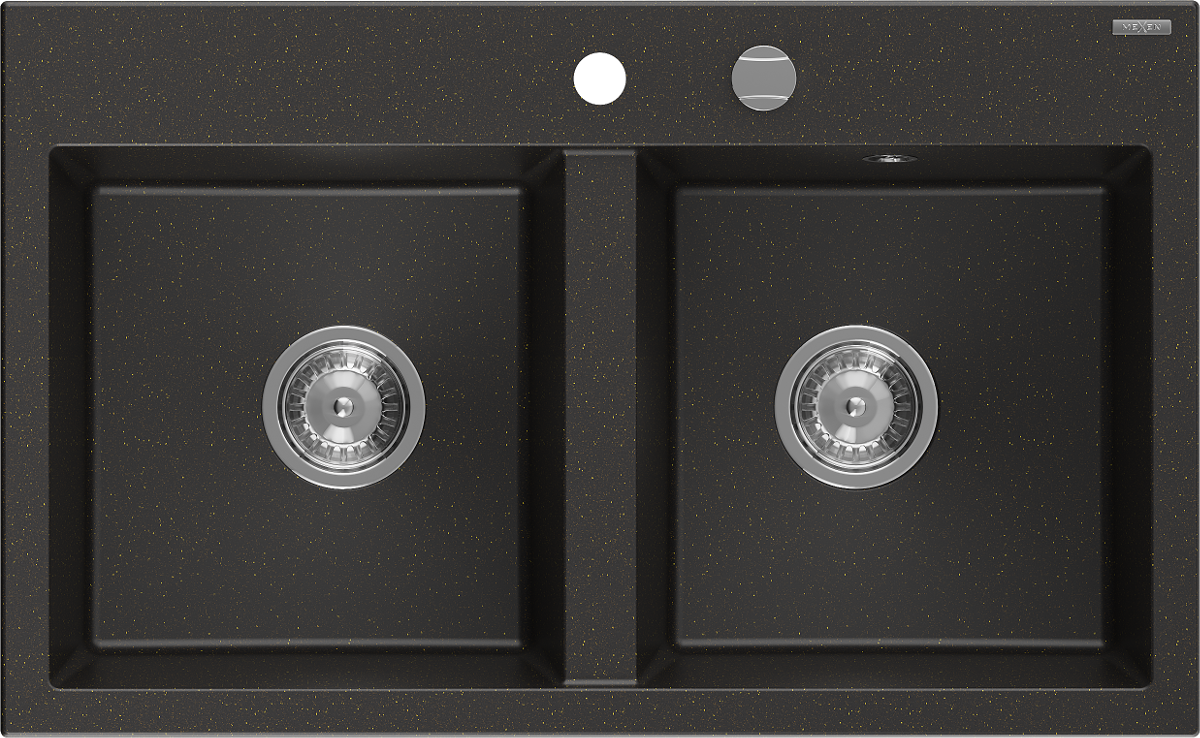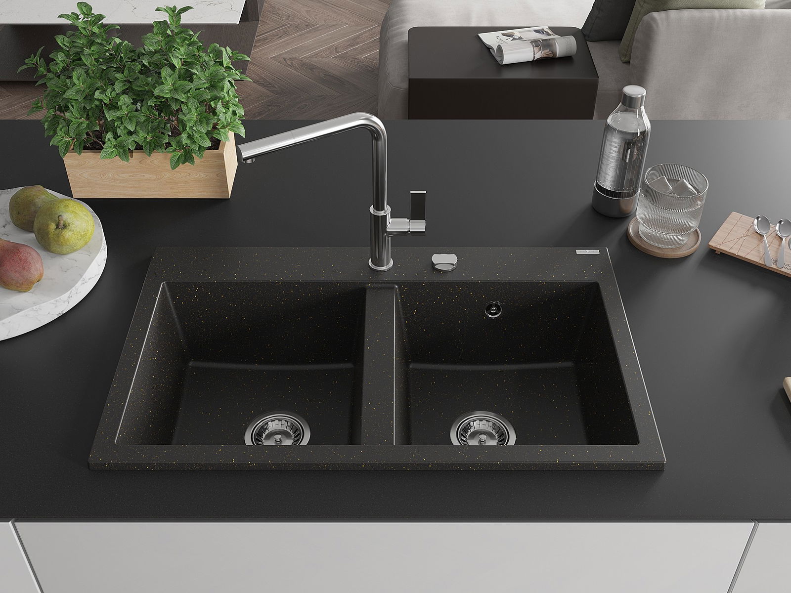 Mexen Hektor granitový drez 2-komorový 800 x 480 mm, čierny/zlatý metalik, sifón chróm - 6521802000-75