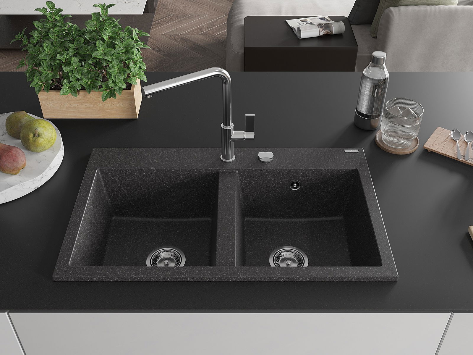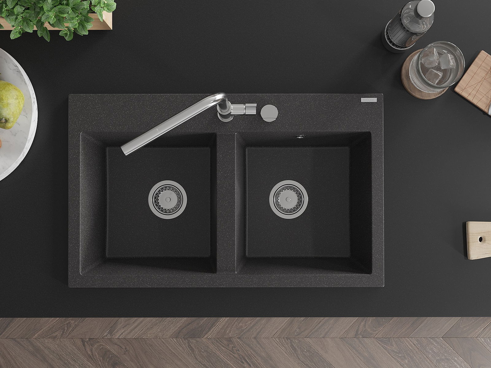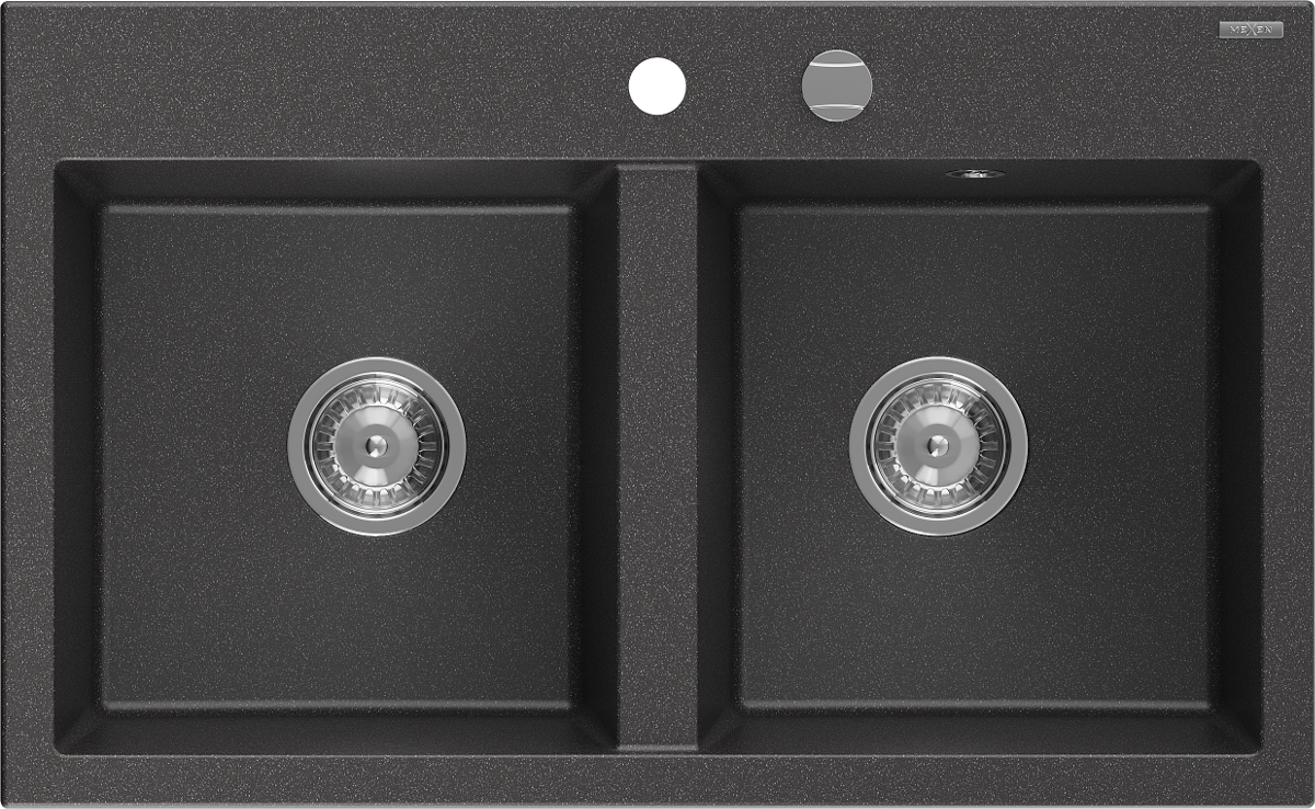 Mexen Hektor dvojkomorový granitový drez 800 x 480 mm, čierny s fľakmi, chrómový sifón - 6521802000-76
