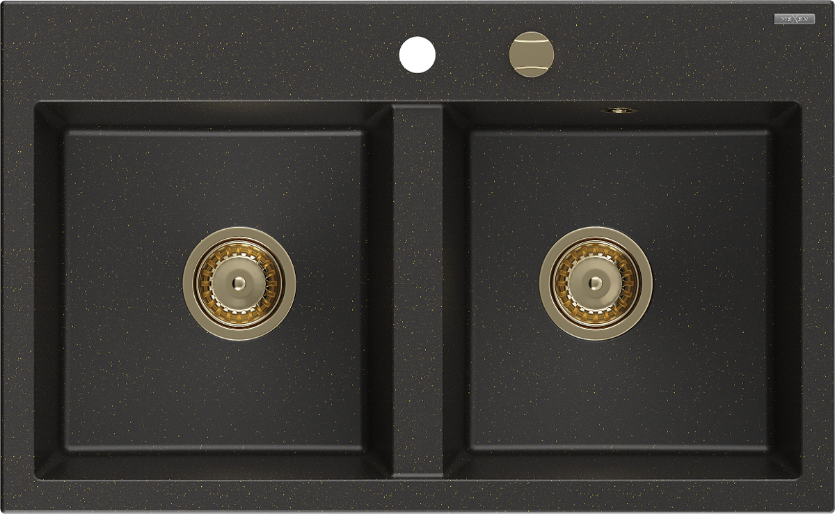 Mexen Hektor žulový drez s 2 komorami 800 x 480 mm, čierny/zlatý metalik, sifón zlatý - 6521802000-75-G