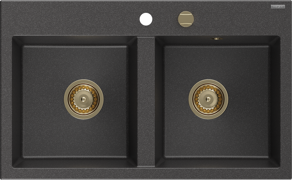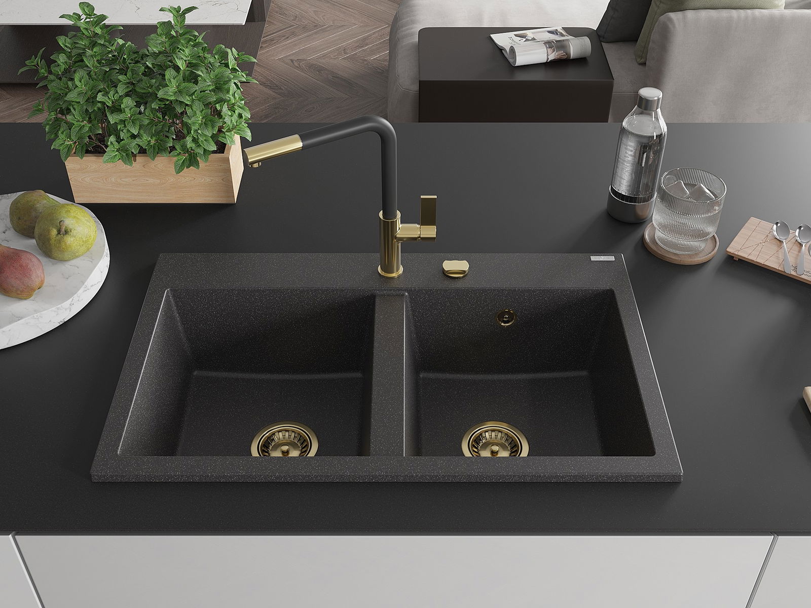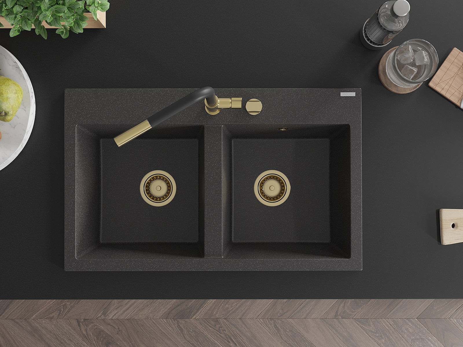Mexen Hektor granitový drez s dvoma komorami 800 x 480 mm, čierny s bodkami, sifón zlatý - 6521802000-76-G