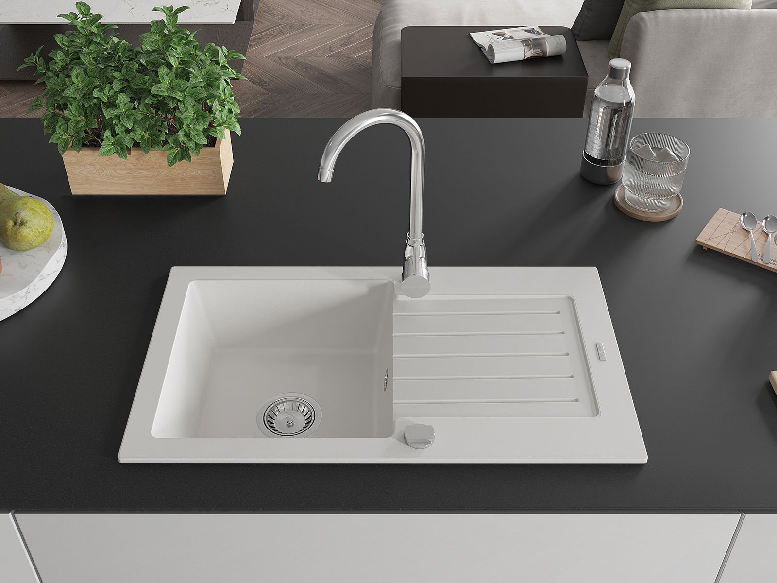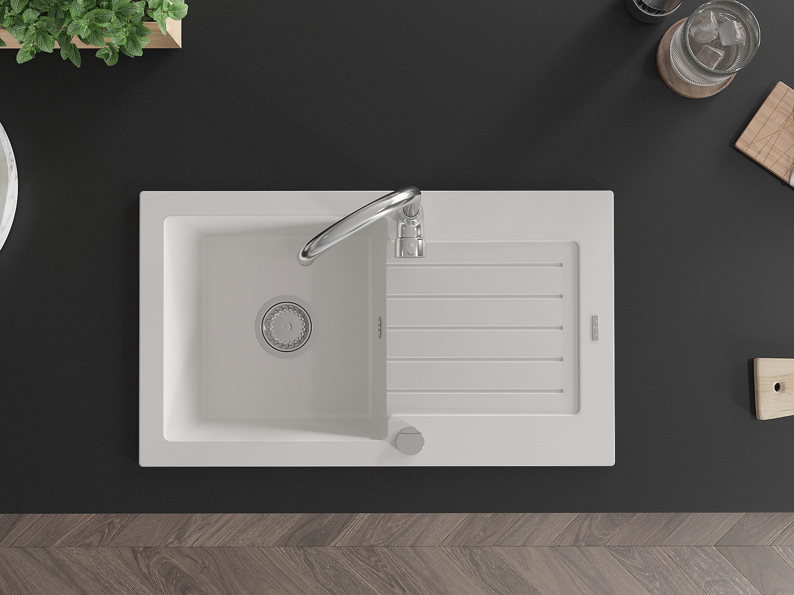 Povrch umývadla je odolný voči škvrnám a sfarbeniu, vďaka čomu sa ľahko čistí a zachováva si svoju farbu po dlhú dobu. Estetický a prakticky dopĺňajúci každú kuchyňu.
