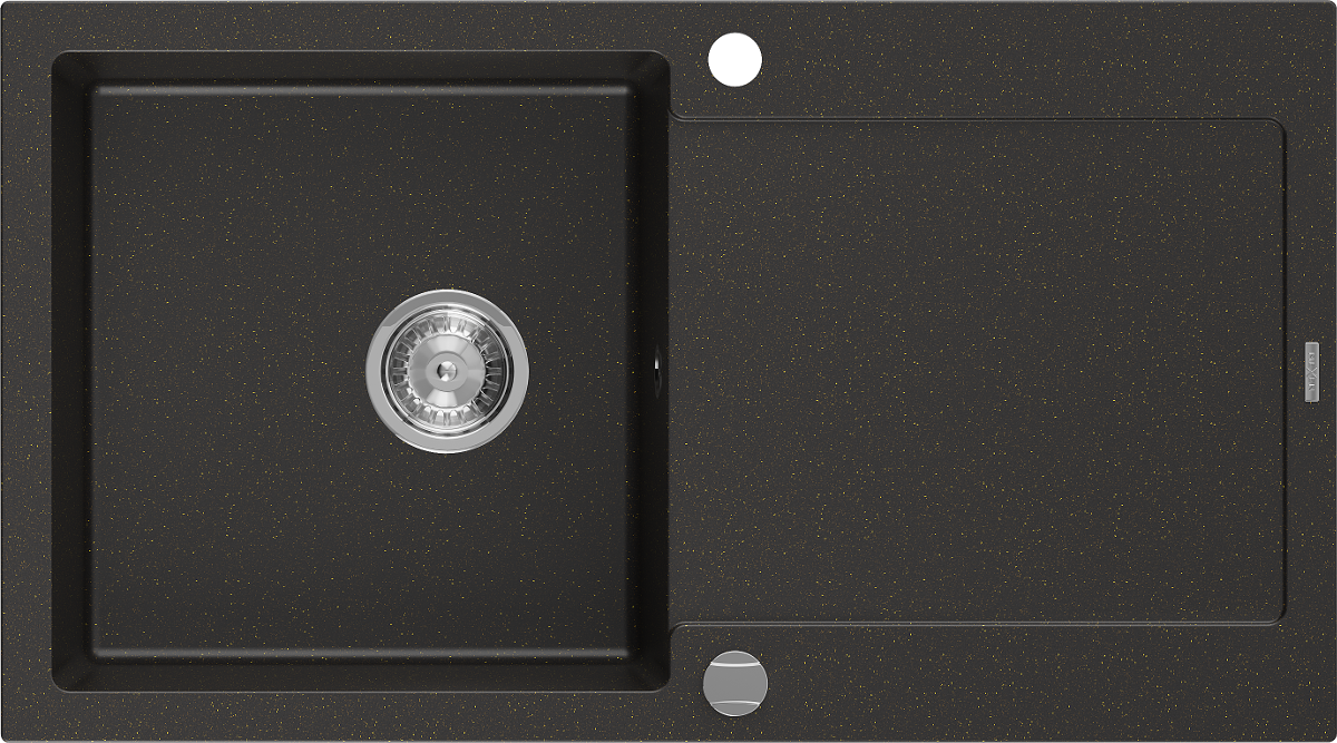 Mexen Leo žulový kuchynský drez 1-komorový s odkvapkávačom 900 x 500 mm, čierny/zlatý metalický, chróm sifón - 6501901010-75