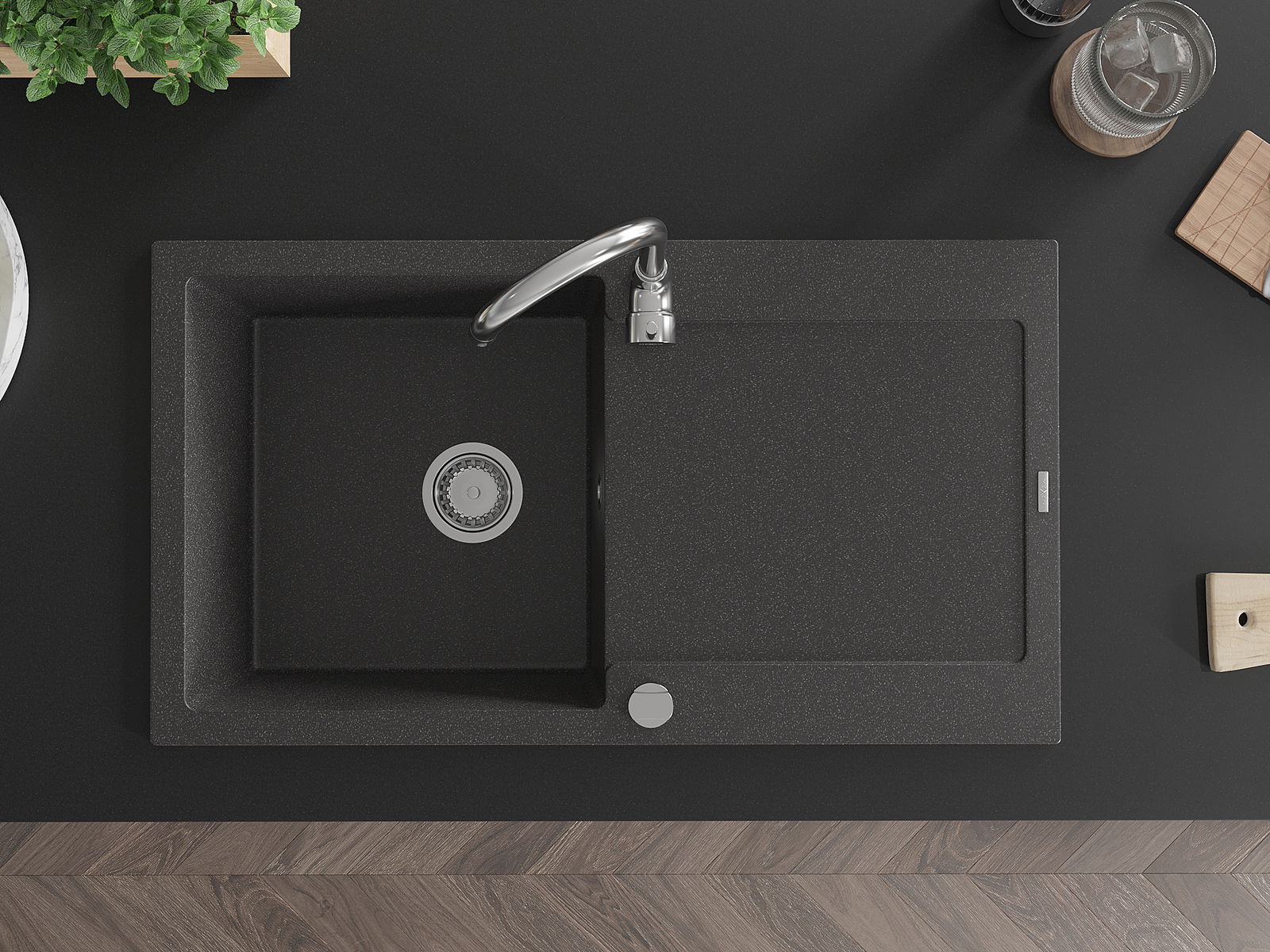 Mexen Leo žulový kuchynský drez s odkvapkávacou plochou 900 x 500 mm, čierny škvrnitý, sifón chróm - 6501901010-76