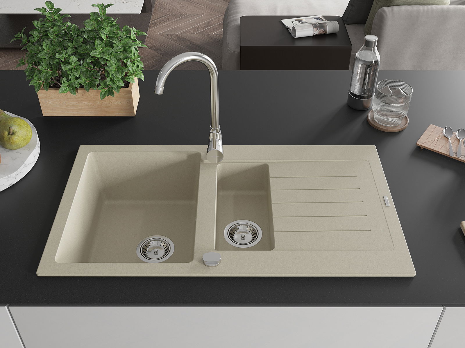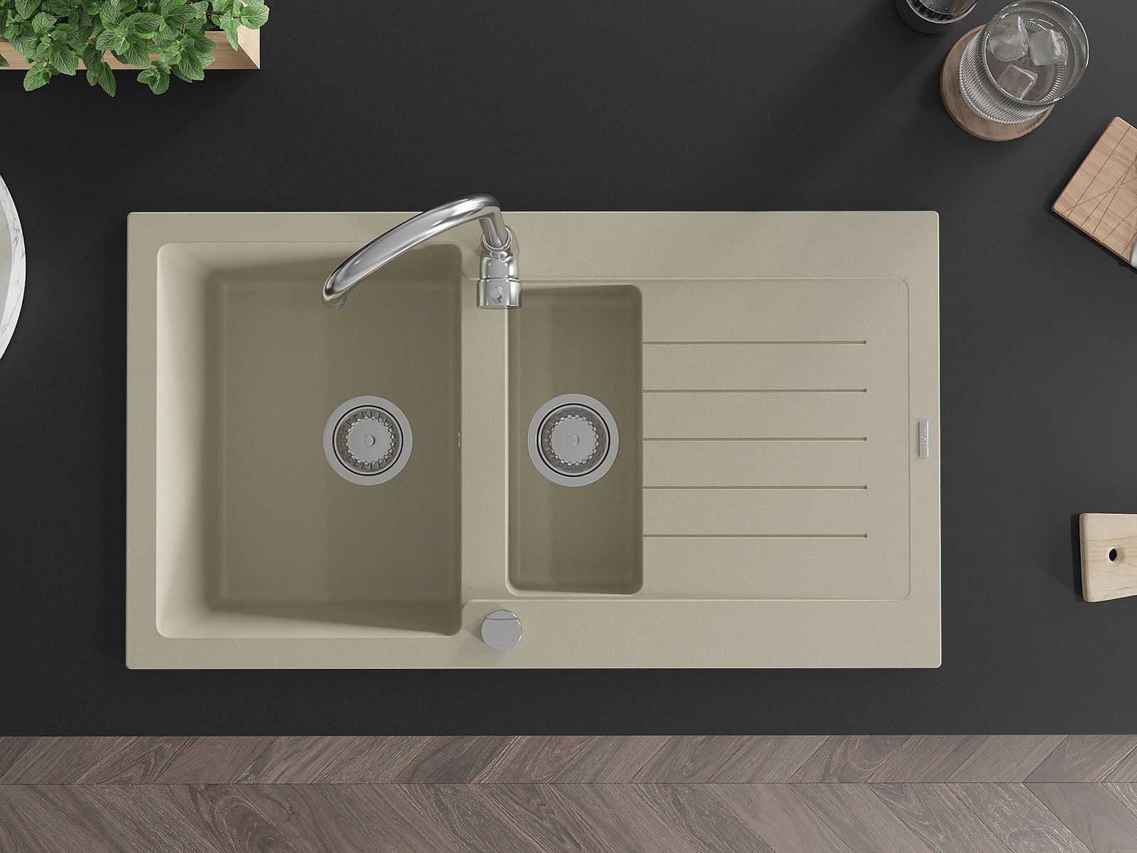 Povrch umývadla je odolný voči škvrnám a sfarbeniu, vďaka čomu sa ľahko čistí a zachováva si svoju farbu po dlhú dobu. Estetický a prakticky dopĺňajúci každú kuchyňu.