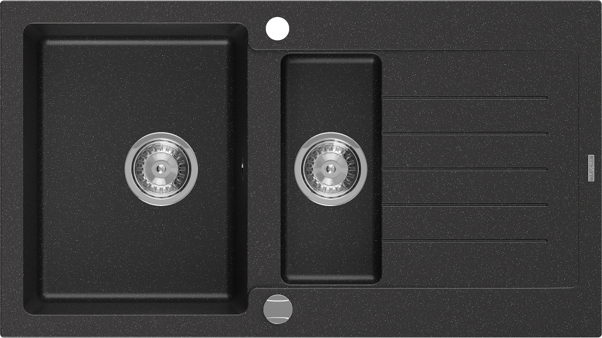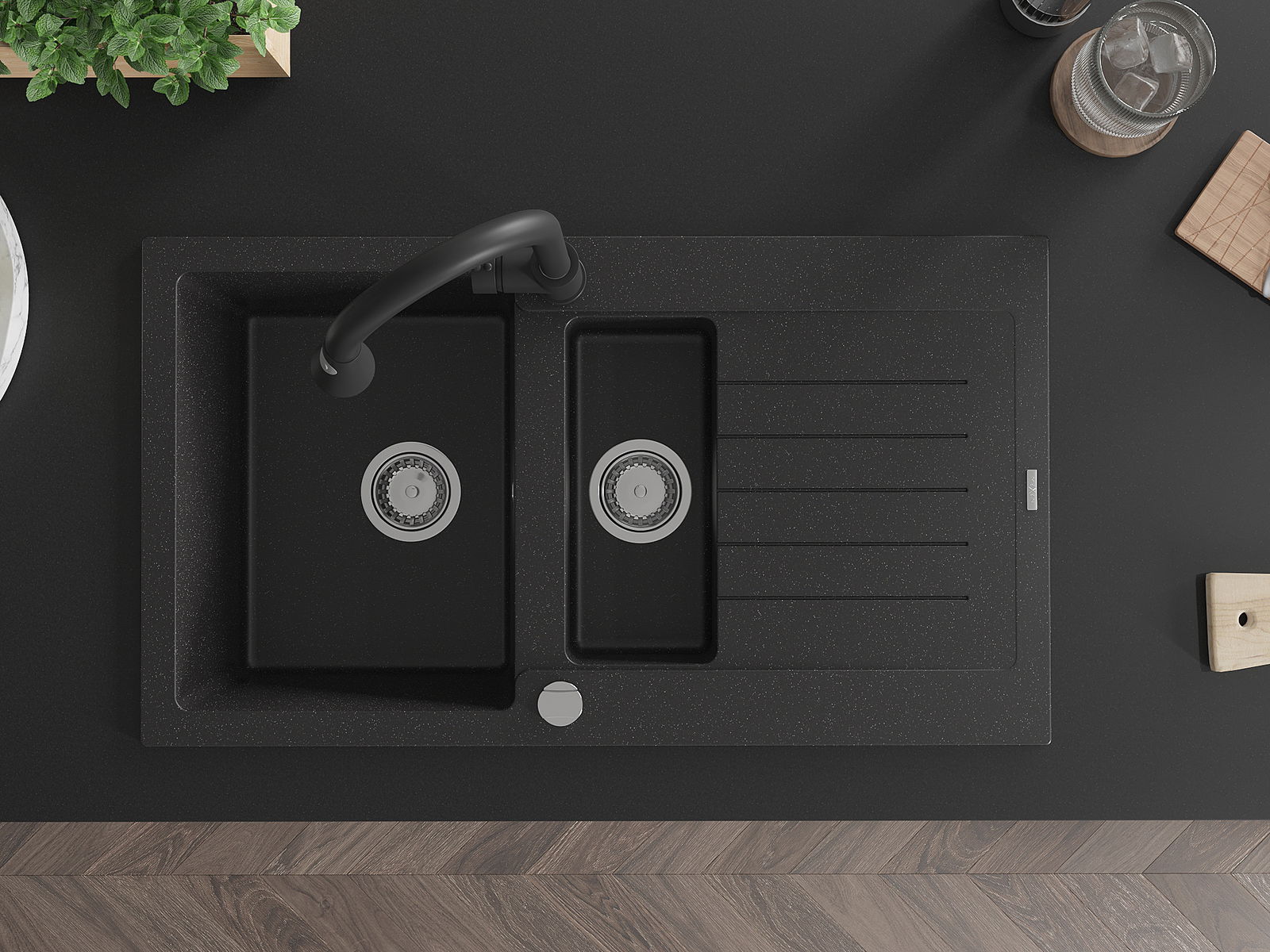 • Mexen Matias žulový drez 1,5-komorový s odkvapkávačom 900 x 505 mm, čierny/strieborný metalik, sifón chróm - 6502901505-73