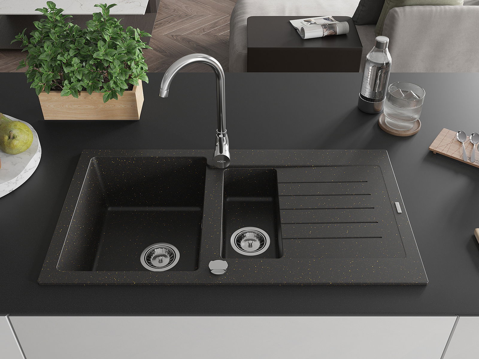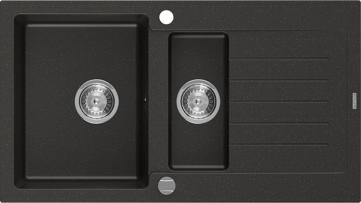 Mexen Matias žulový drez 1,5-komorový s odkvapkávačom 900 x 505 mm, čierny/zlatý metalický, sifón chróm - 6502901505-75