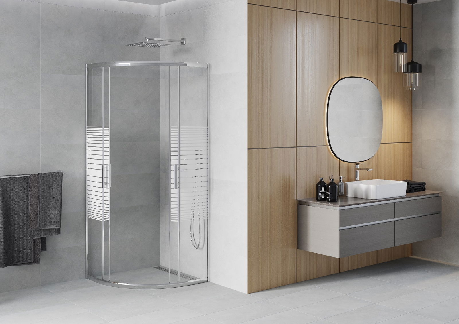 Praktická a pohodlná rukoväť je vyrobená z odolného a pevného kovu. Moderný tvar v kombinácii s povrchovou úpravou prispôsobenou farbe profilov dodáva celku moderný a štýlový vzhľad, zdôrazňujúc estetiku každej kúpeľne.