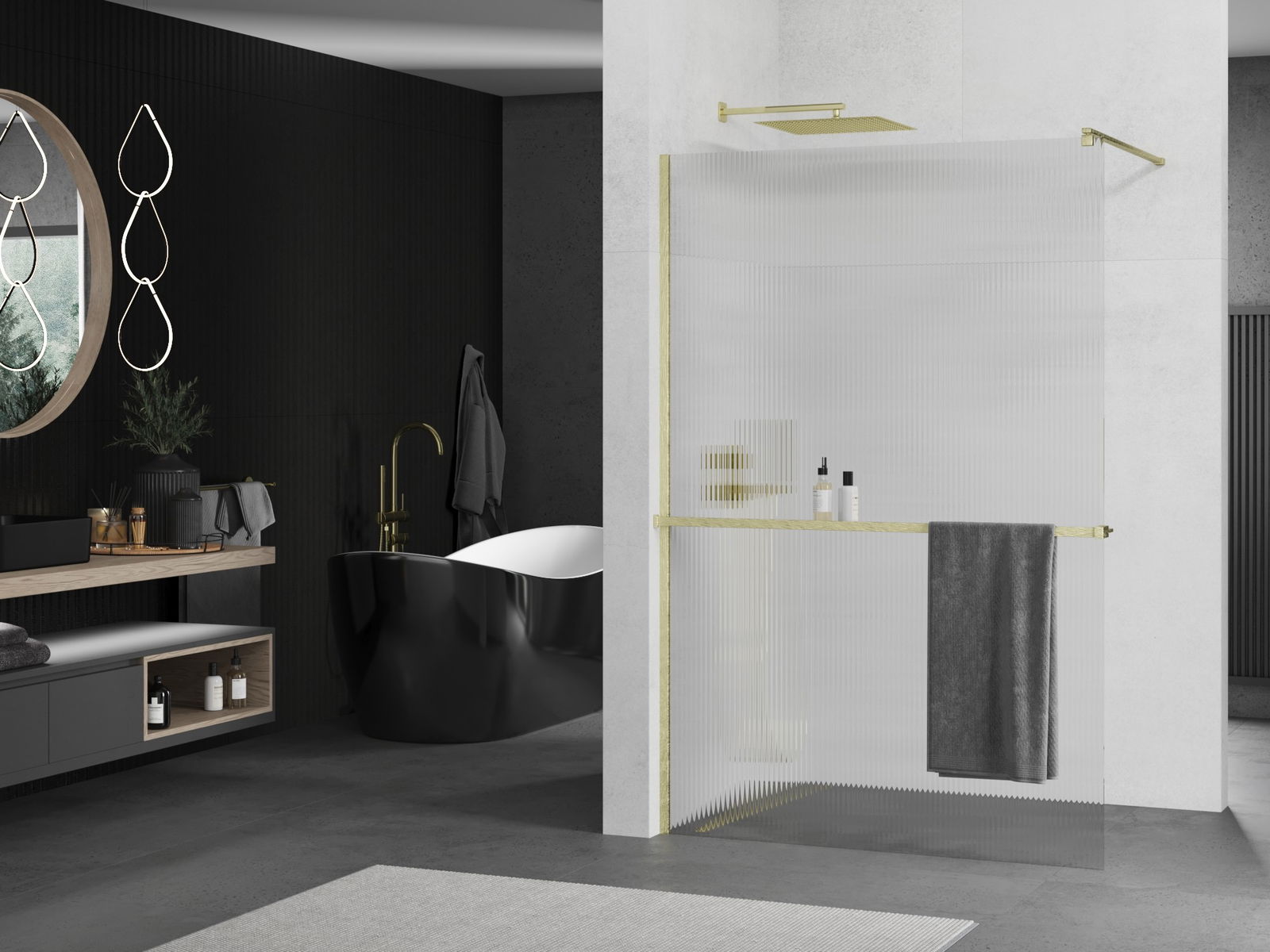 Mexen Kioto+ sprchová stena s policou Walk-in 80 x 200 cm, pruhy, zlatá kartáčovaná - 800-080-121-55-09