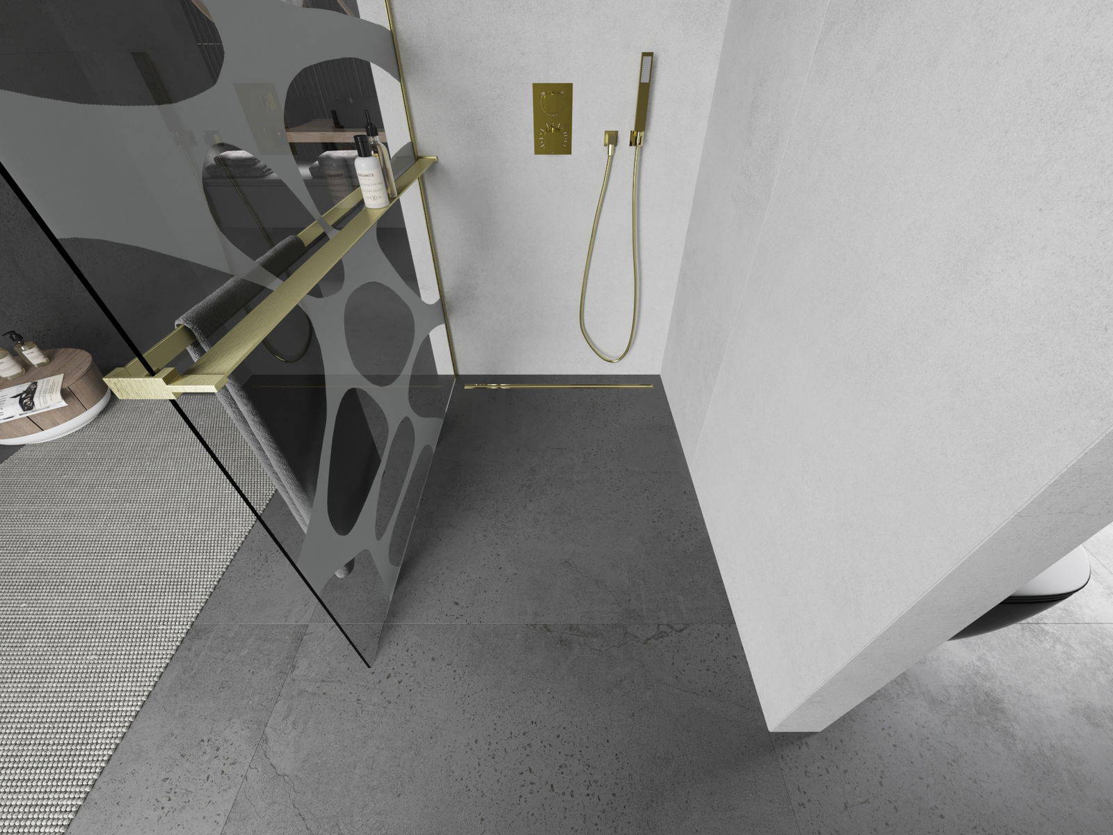 Mexen Kioto+ sprchová stena s policou Walk-in 120 x 200 cm, biela vlna, zlato kartáčovaná - 800-120-121-55-97