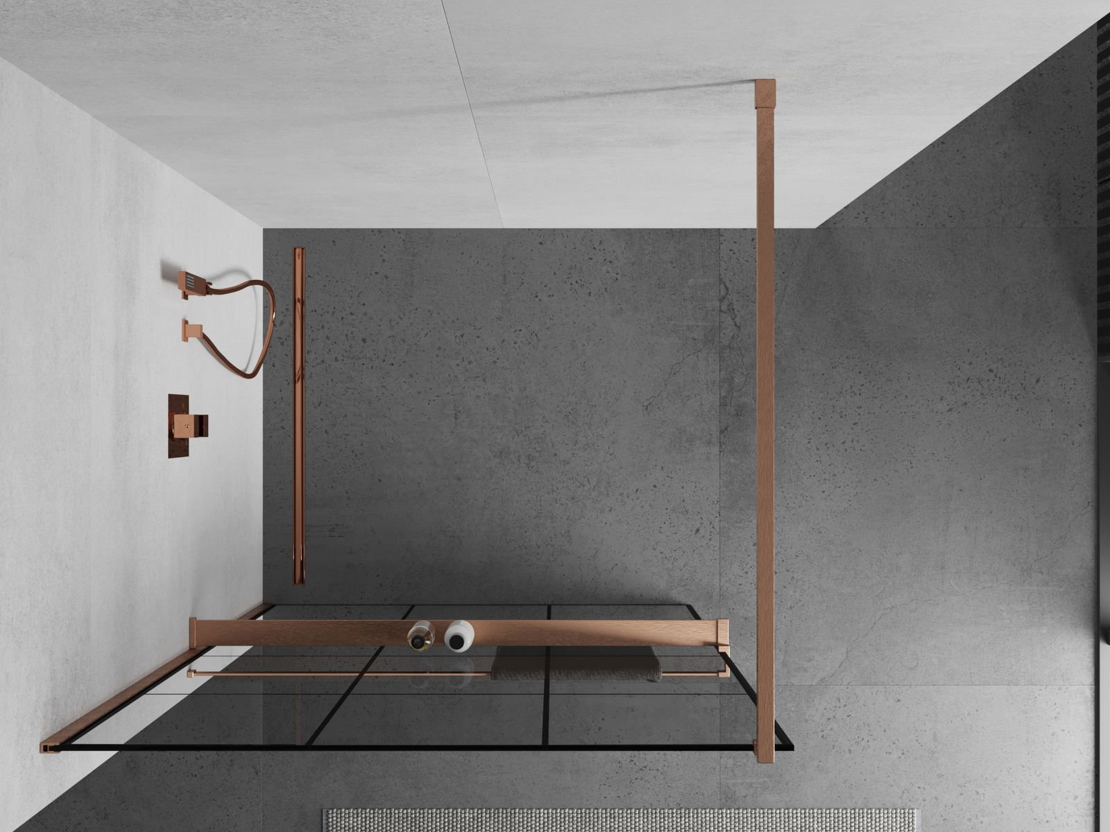 Mexen Kioto+ sprchová stena s poličkou Walk-in 120 x 200 cm, čierna mriežka, brúsená meď - 800-120-121-65-77
