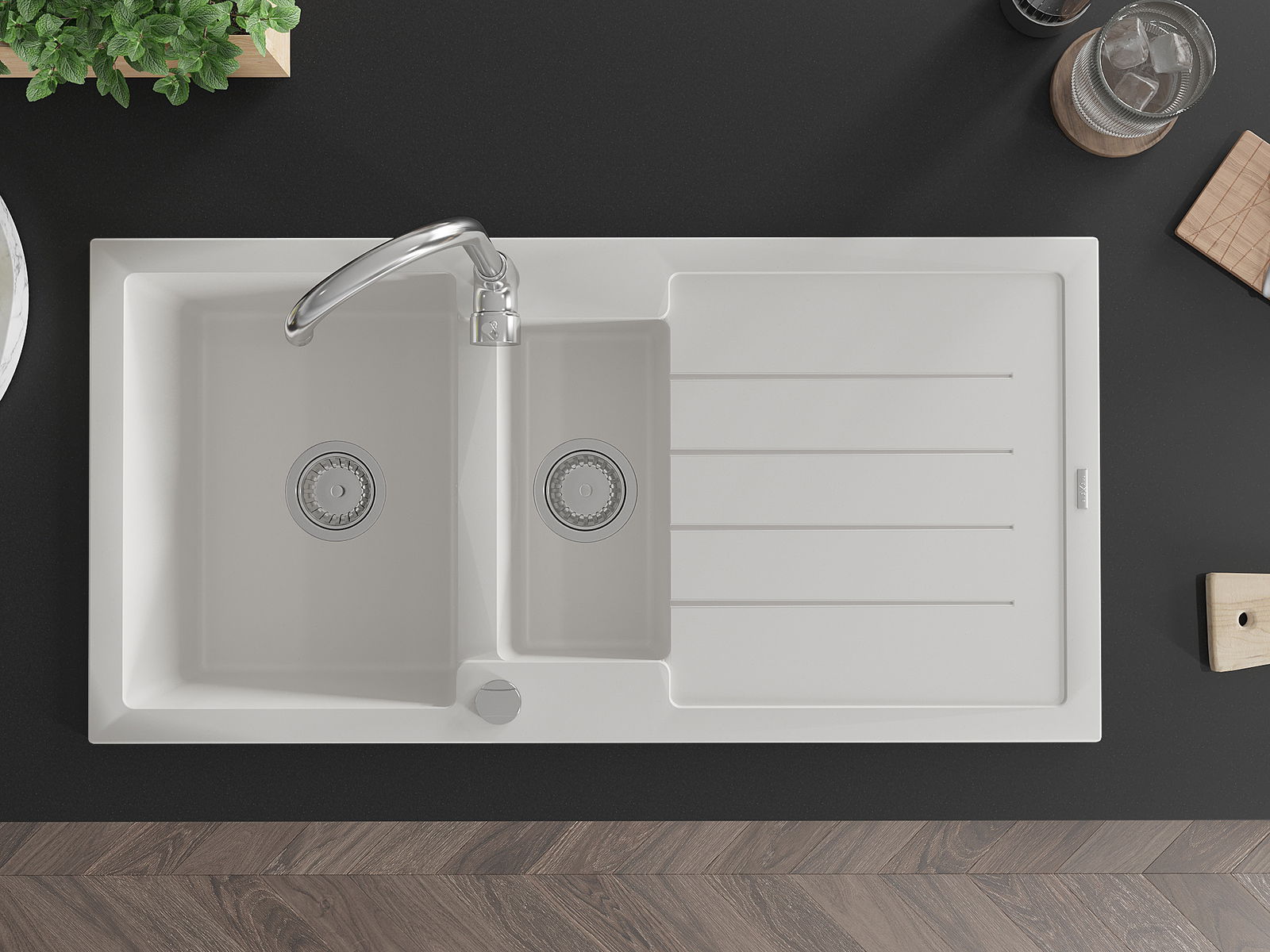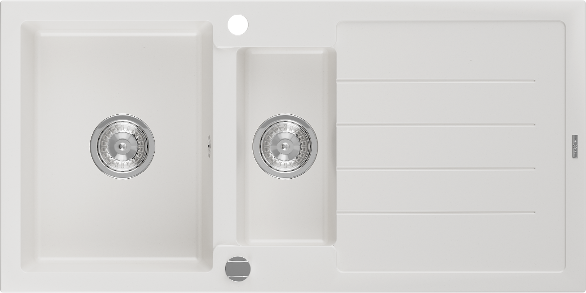Povrch kuchynského drezu je odolný voči škvrnám a zafarbeniu, vďaka čomu sa ľahko udržiava a zachováva svoju farbu počas dlhého obdobia používania. Estetický a praktický doplnok pre každú kuchyňu.