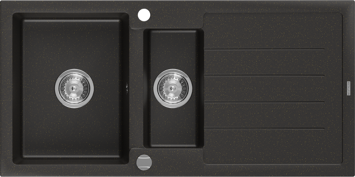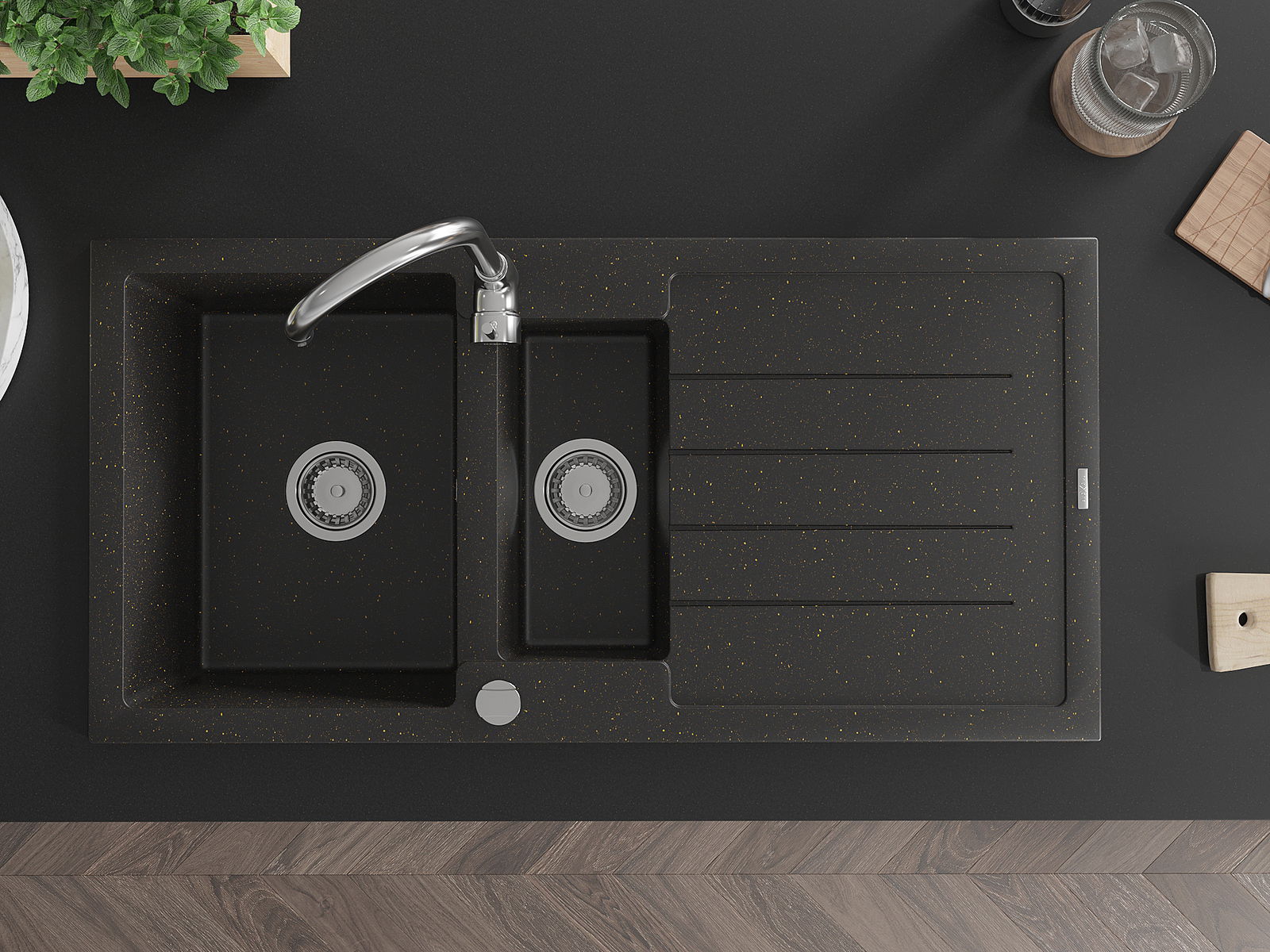 Mexen Andres granitový drez 1,5-komorový s odkvapkávačom 1000 x 500 mm, čierny/zlatý metalik, sifón chróm - 6515101510-75