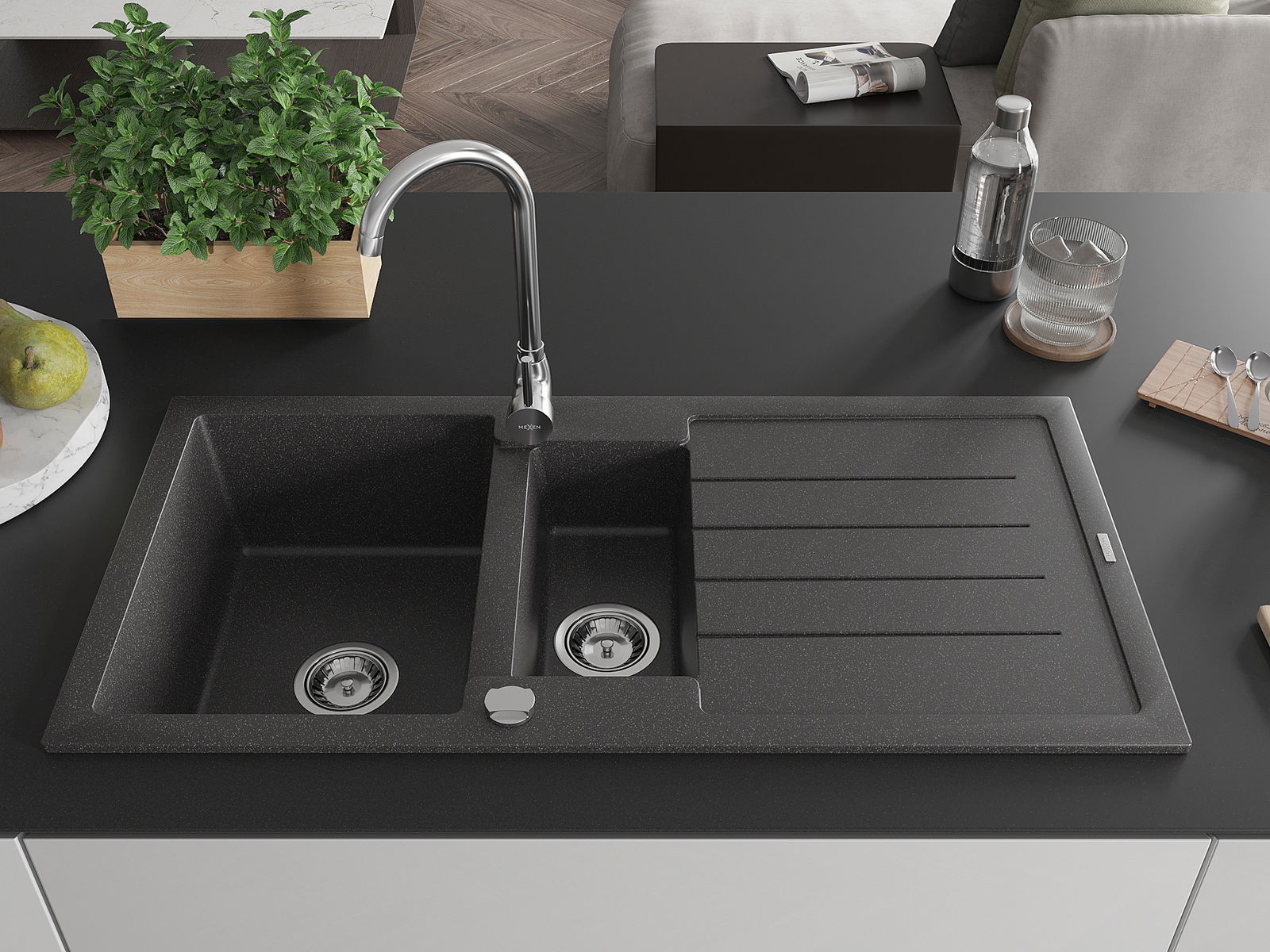 Mexen Andres granitový drez 1,5-komorový s odkvapkávačom 1000 x 500 mm, čierny fľakatý, sifón chróm - 6515101510-76