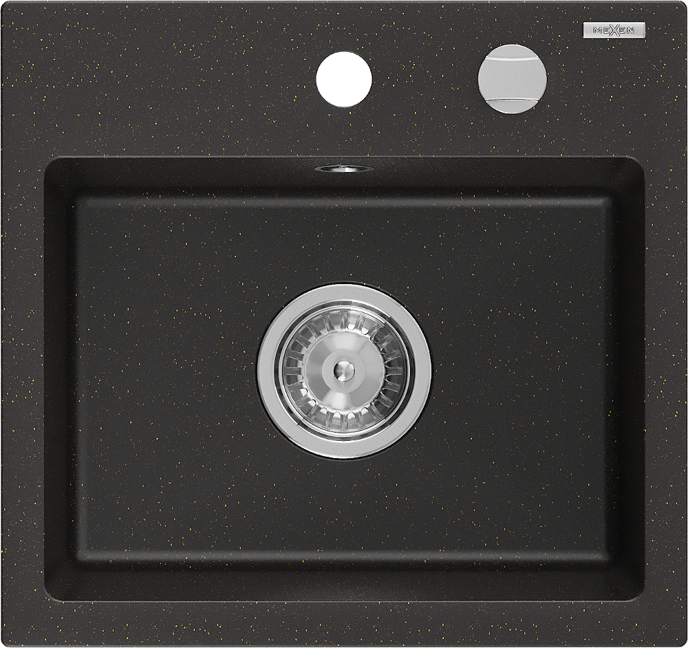 Mexen Milo granitový drez 1-komorový 435 x 410 mm, čierny/zlatý metalik, sifón chróm - 6505441000-75