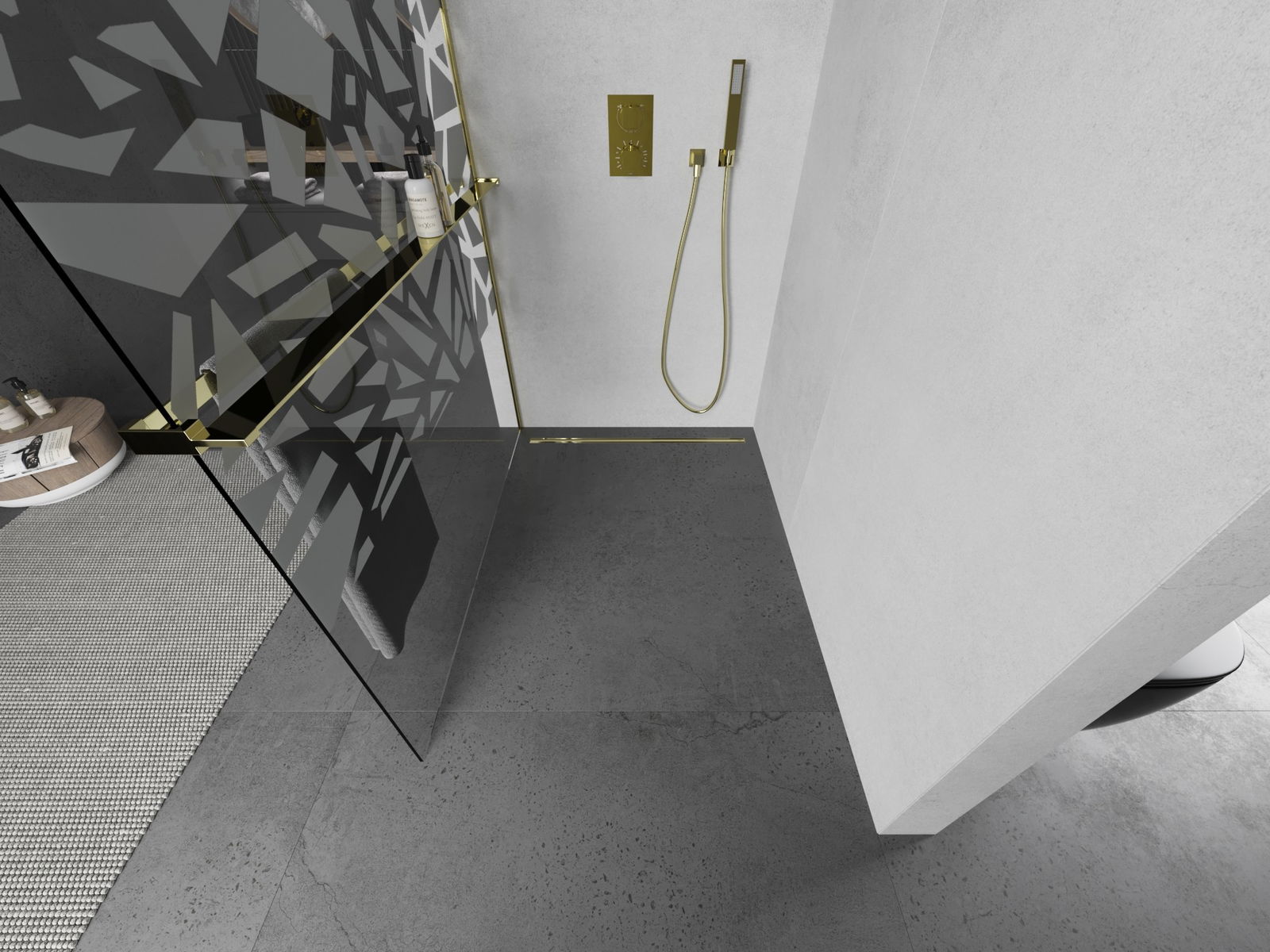 Mexen Kioto+ L sprchová stena s policou Walk-in 110 x 200 cm, biely vzor, zlatá - 800-110-123-50-85