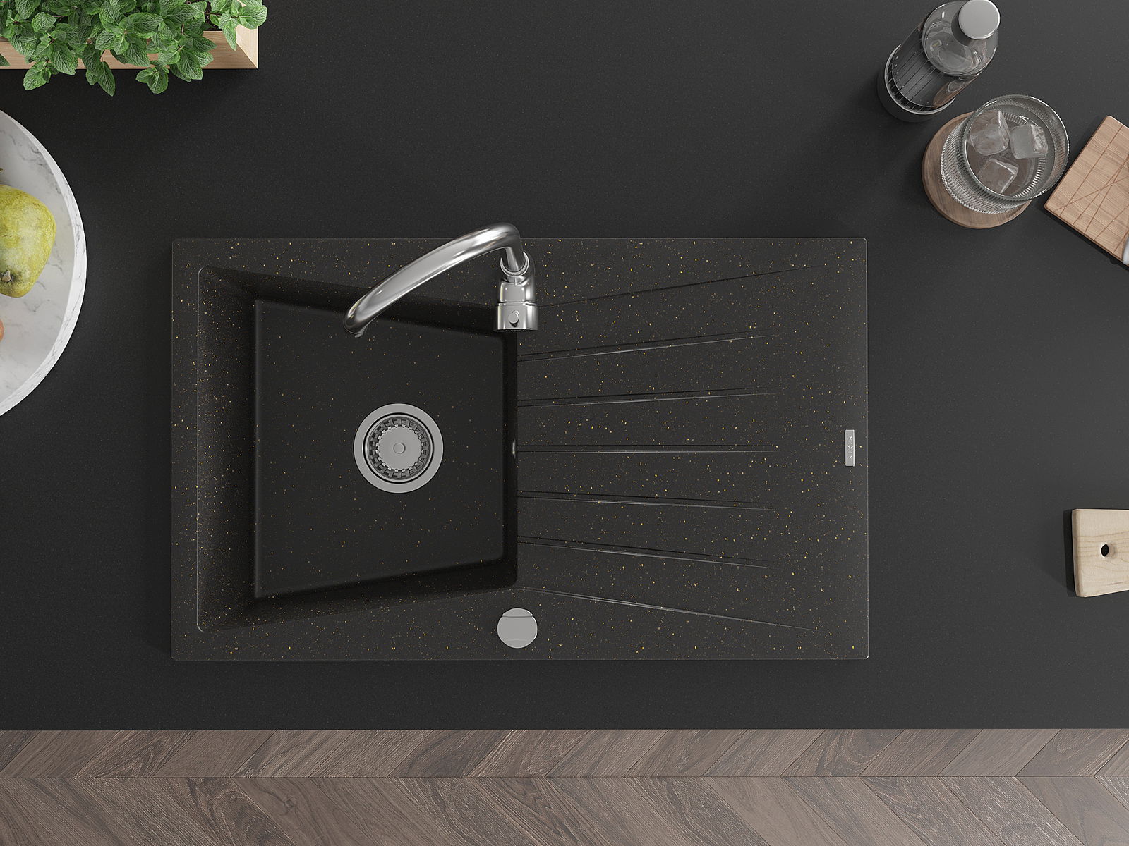 Mexen Cesar granitový drez s 1 komorou a odkvapkávačom 775 x 470 mm, čierny/zlatý metalický, sifón chróm - 6514771010-75