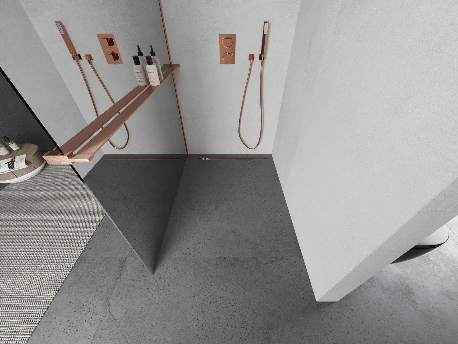Mexen Kioto+ L sprchová stena s policou Walk-in 90 x 200 cm, zrkadlo, brúsená meď - 800-090-123-65-50