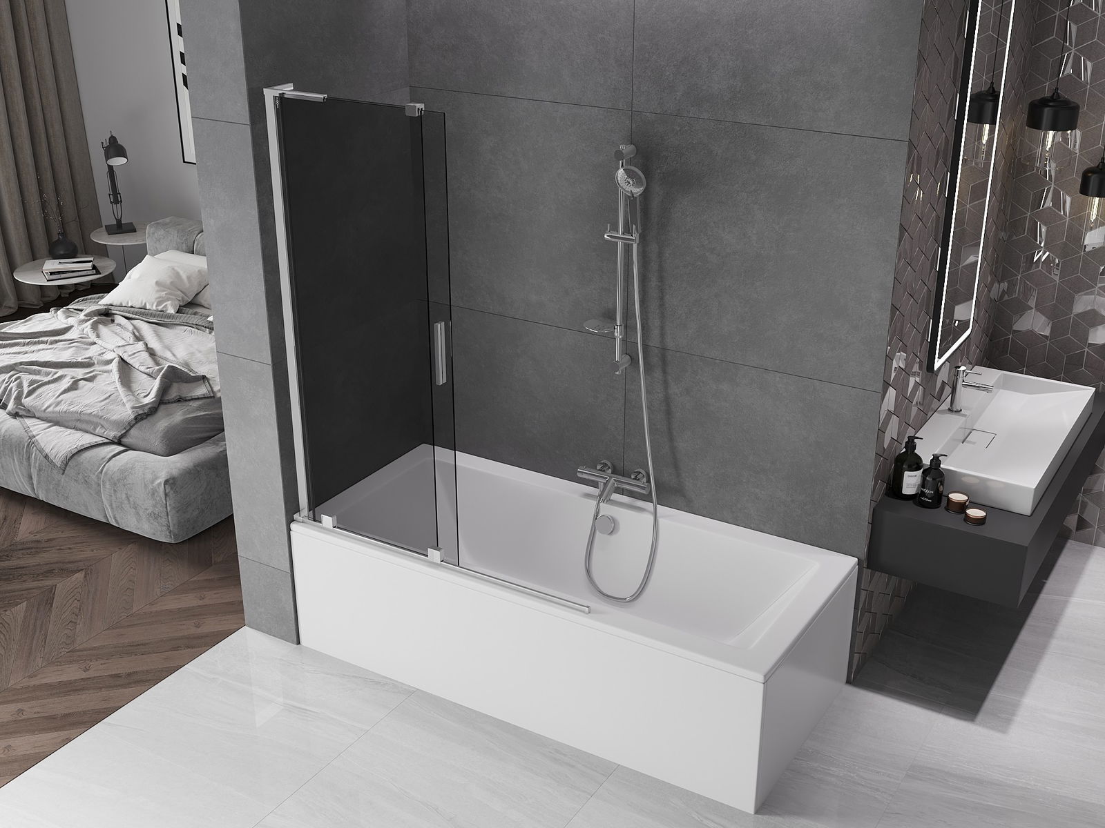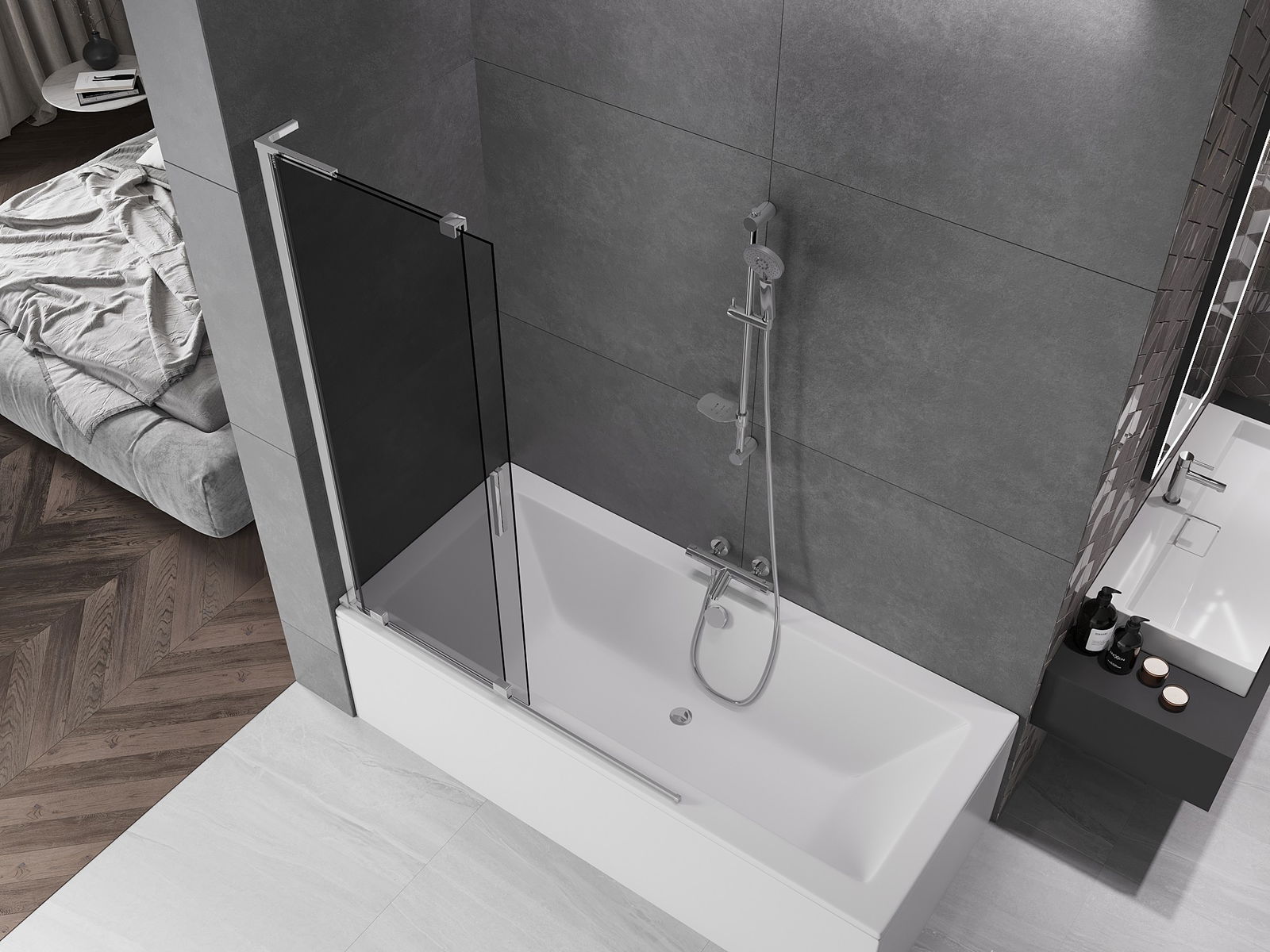 Mexen Velar L paraván na vaňu 2-krídlový zasúvací 120 x 150 cm, grafit, chróm - 896-120-003-41-01
