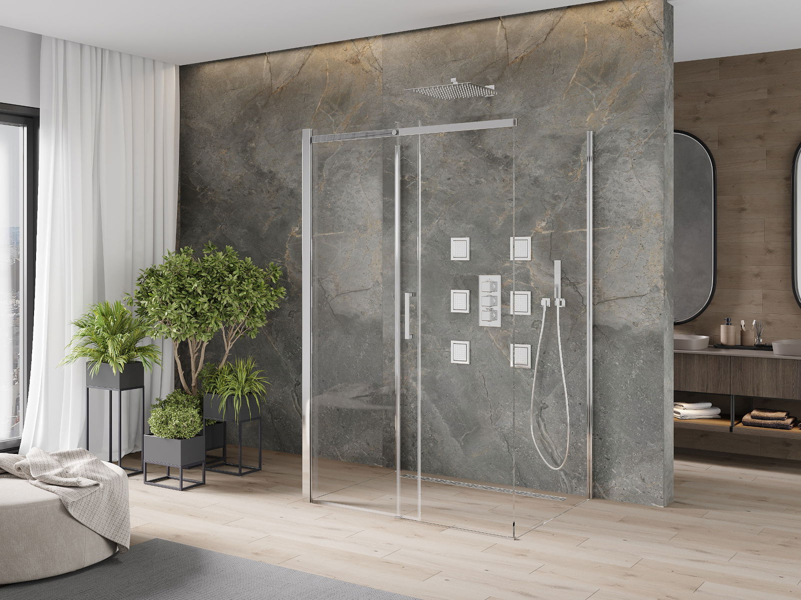 Posuvné dvere sa pohybujú po špeciálnych koľajniciach a nevyžadujú dodatočný priestor na otvorenie, preto sú ideálne pre menšie kúpeľne. Vďaka dvojitým kolieskam s kovovým telom je ich pohyb plynulý.