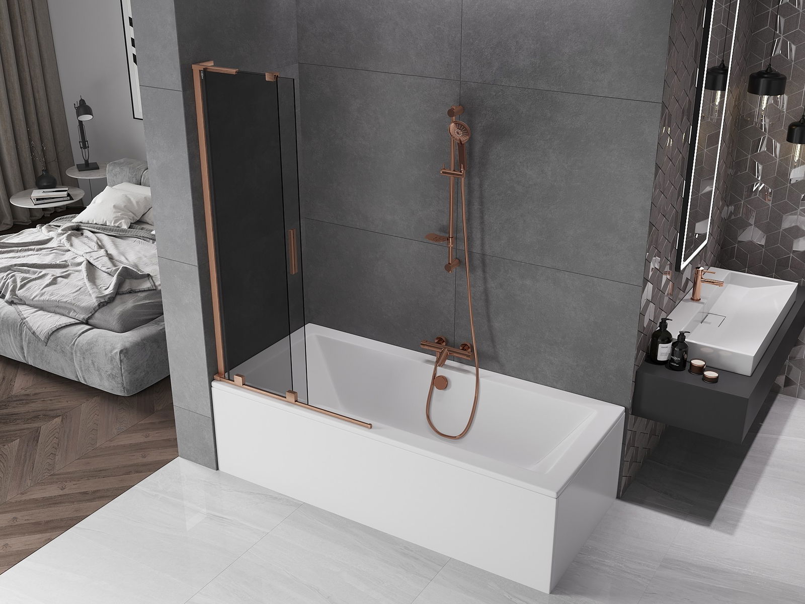 Mexen Velar L vaňová zástená 2-krídlová zasúvacia 95 x 150 cm, grafit, kartáčovaná meď - 896-095-003-41-65