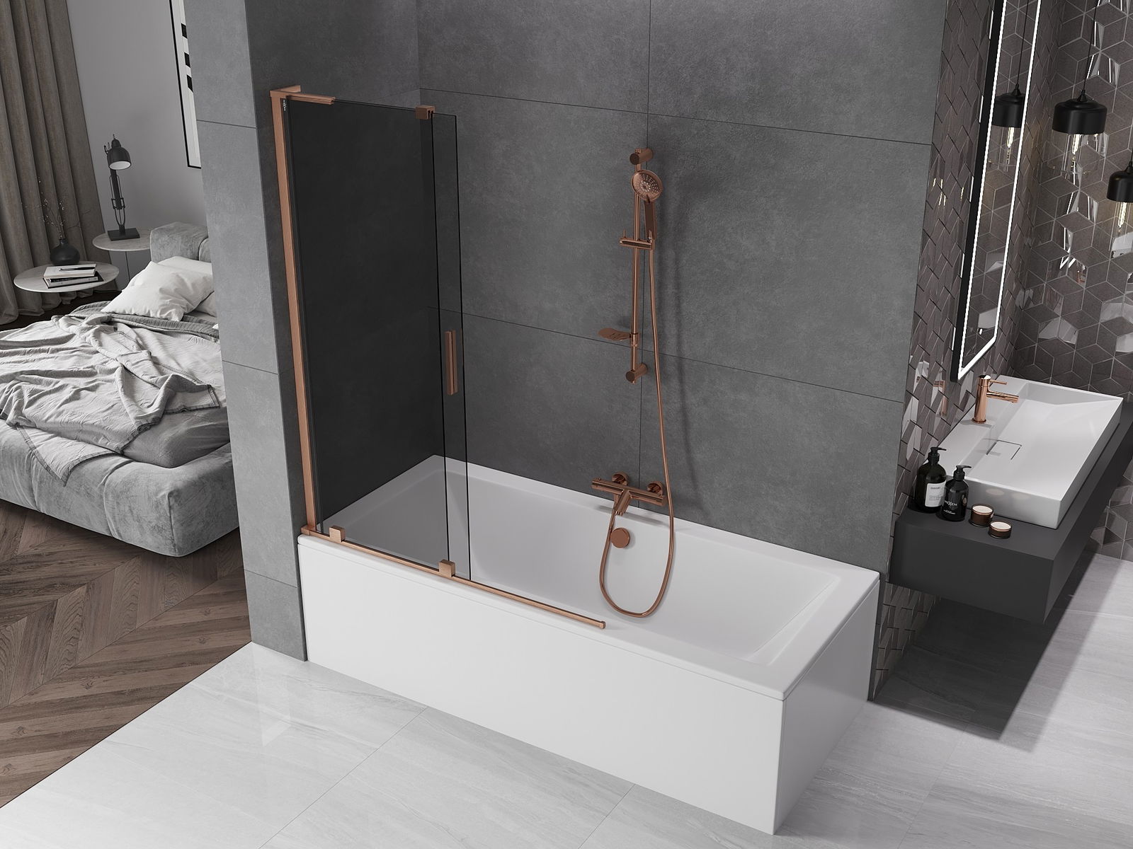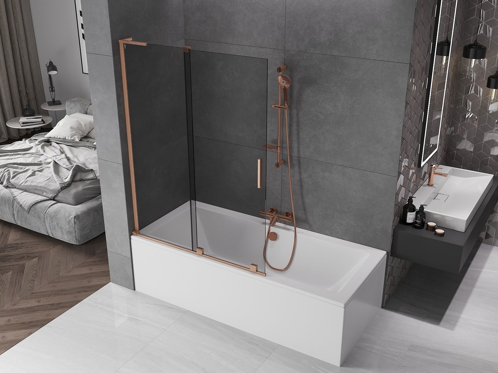 Mexen Velar L vaňová zástena so 2 krídlami, posuvná 120 x 150 cm, grafit, brúsená meď - 896-120-003-41-65
