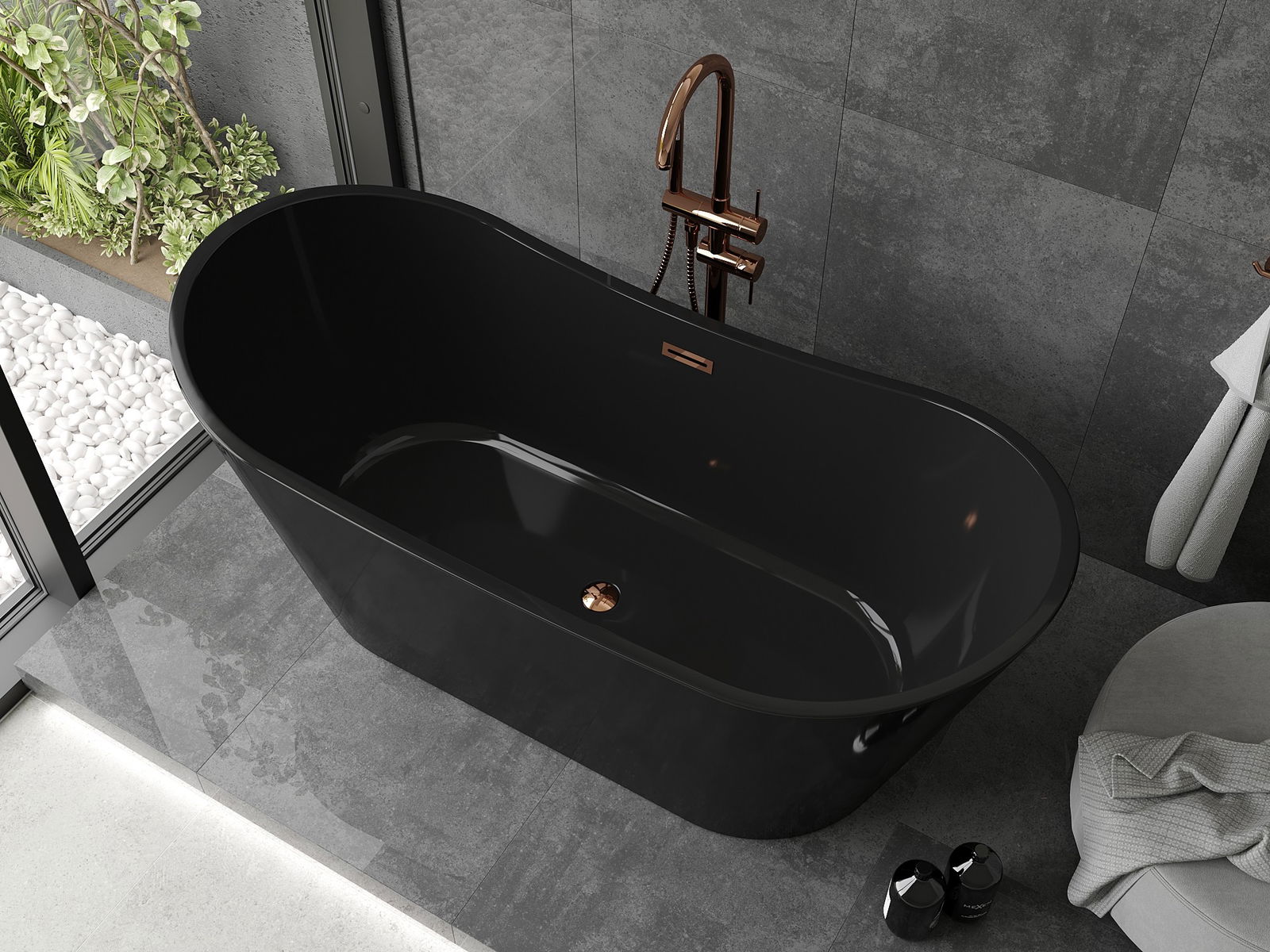 Samostatne stojaca vaňa Mexen Montana s rozmermi 170 x 80 cm je kombináciou moderného dizajnu a funkčnosti. Vyrobená zo sanitárneho akrylu, vyniká elegantnou čiernou farbou a povrchovou úpravou v ružovom zlate, čo jej dodáva výnimočný charakter. Oválny tvar a výrez na stred zaručujú pohodlie pri používaní. Vaňa je odolná voči matovaniu a UV žiareniu, čo zaručuje dlhodobý efekt. Súčasťou balenia je sifón a zátka klik klak.