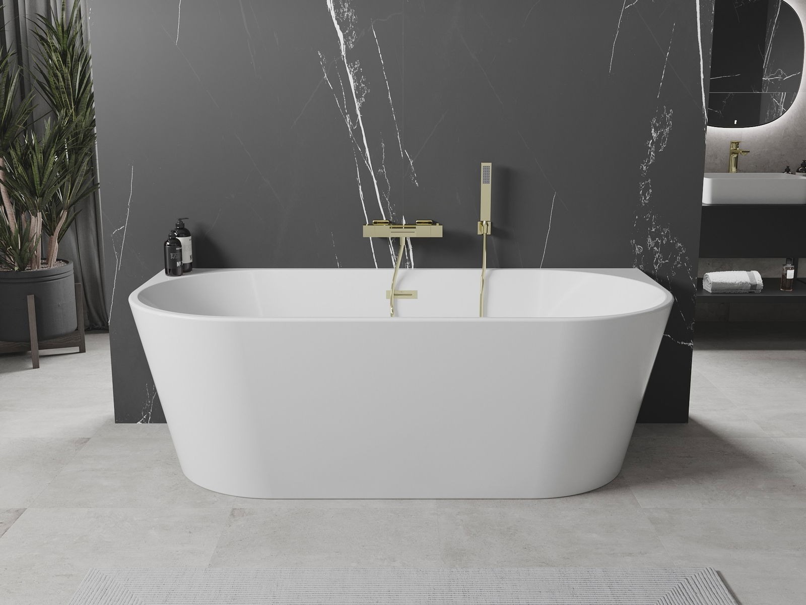 Mexen Oval je elegantná voľne stojaca vaňa pri stene s rozmermi 160 x 80 cm, v bielom prevedení, vyrobená zo sanitárneho akrylu. Svojím oválnym tvarom sa ideálne hodí do moderných interiérov. Vaňa má výšku 58 cm a hĺbku 45 cm, čo zaručuje komfort používania. Povrchová úprava v zlatom kartáčovanom tóne jej dodáva luxusný charakter. Disponuje otvorom pre prepad a súčasťou balenia je sifón a zátka klik klak, pričom materiál je odolný voči matovaniu a UV žiareniu, čo zaručuje trvanlivosť.