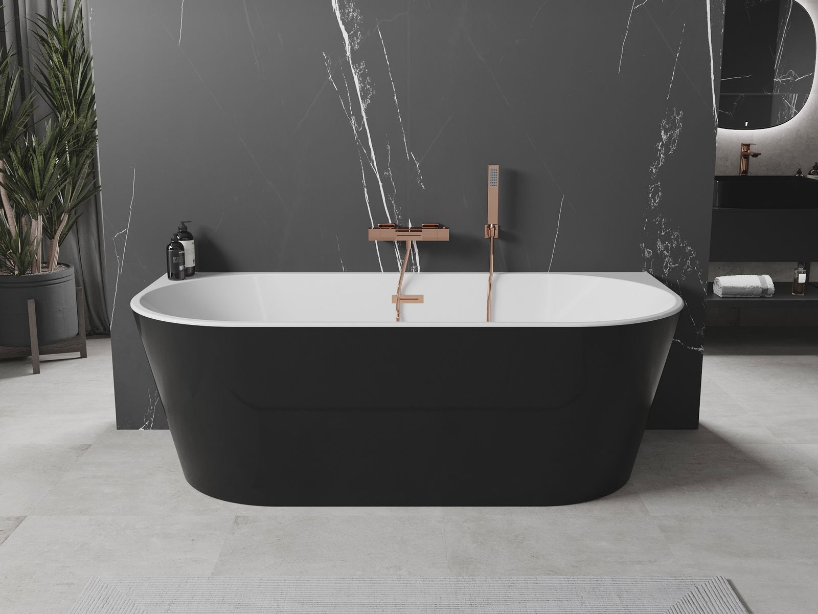 Oválna voľne stojaca vaňa s rozmermi 160 x 80 cm je ideálna pre moderné kúpeľne. Vyrobená zo sanitárneho akrylu, vyznačuje sa vysokou odolnosťou voči matovaniu a UV žiareniu. Biela a čierna farebná kombinácia s povrchovou úpravou ružovým zlatom dodáva eleganciu. Vaňa je navrhnutá s prepadovým otvorom a obsahuje sifón, čo ju robí funkčnou voľbou. Vďaka stredovému odtoku a montáži k stene sa ideálne hodí do každej miestnosti.
