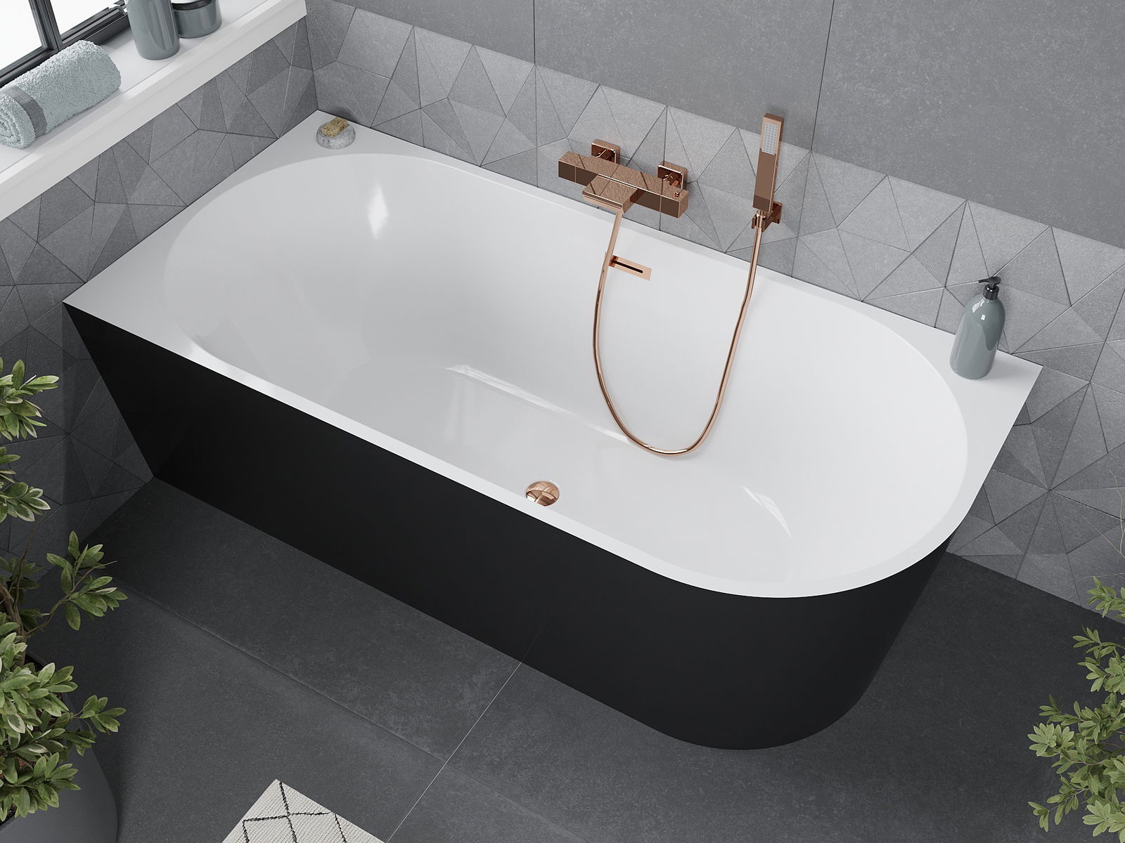 Mexen Mia voľne stojaca rohová vaňa ľavá 150 x 75 cm, biela/čierna, prepad ružové zlato - 52691507575L-60