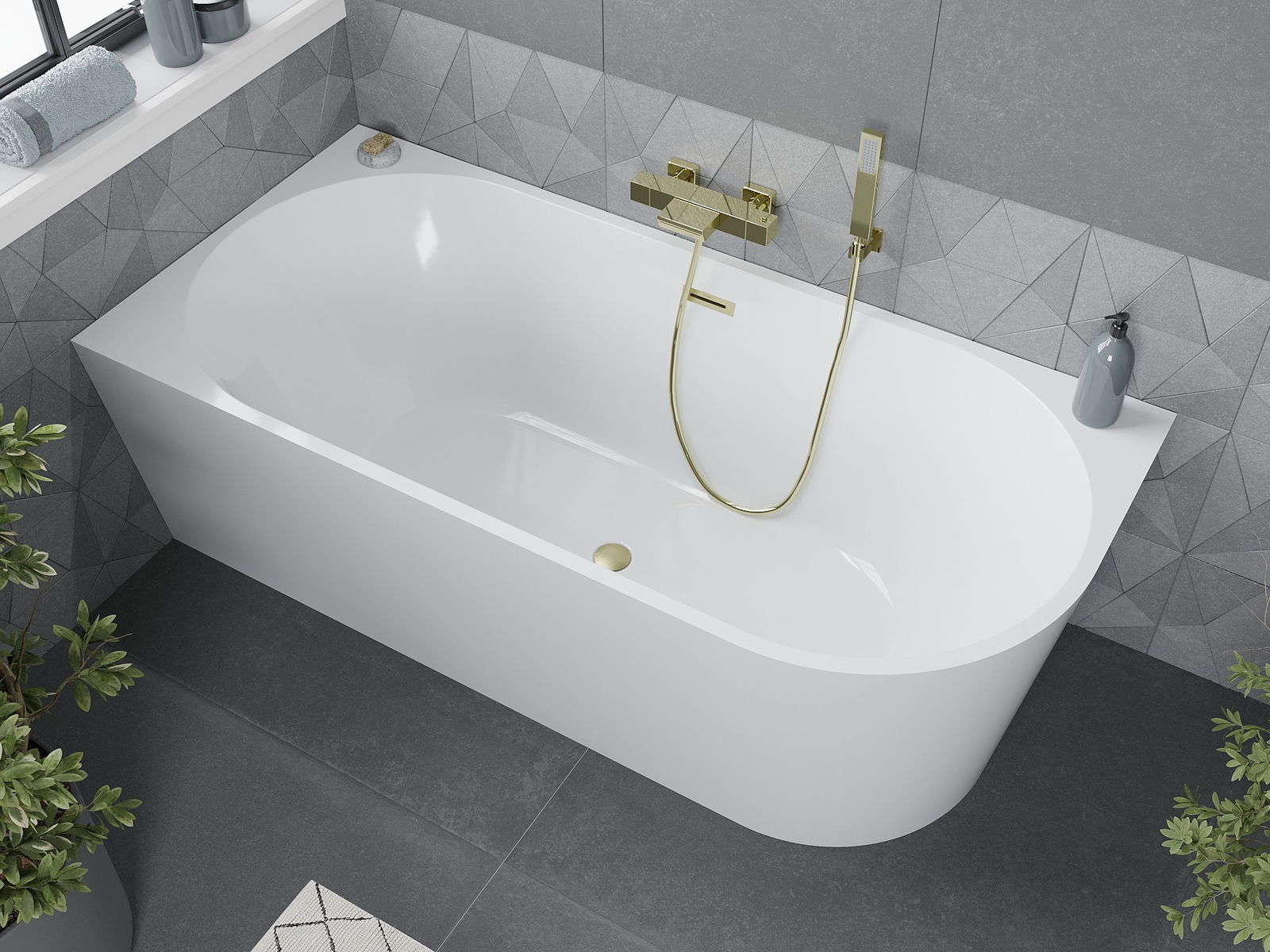Rohová voľne stojaca vaňa s rozmermi 160 x 75 cm je vynikajúcou voľbou pre komfort a štýl. Vyrobená zo sanitárneho akrylu, v bielej farbe a so zlatým kartáčovaným povrchom, sa vyznačuje moderným dizajnom a obdĺžnikovým tvarom. Ponúka pohodlnú rohovú montáž a odolnosť voči matovaniu a UV žiareniu. Súčasťou sú sifón a zátka klik klak. Prepad a odtok v strede zabezpečujú maximálnu funkčnosť v každej kúpeľni.