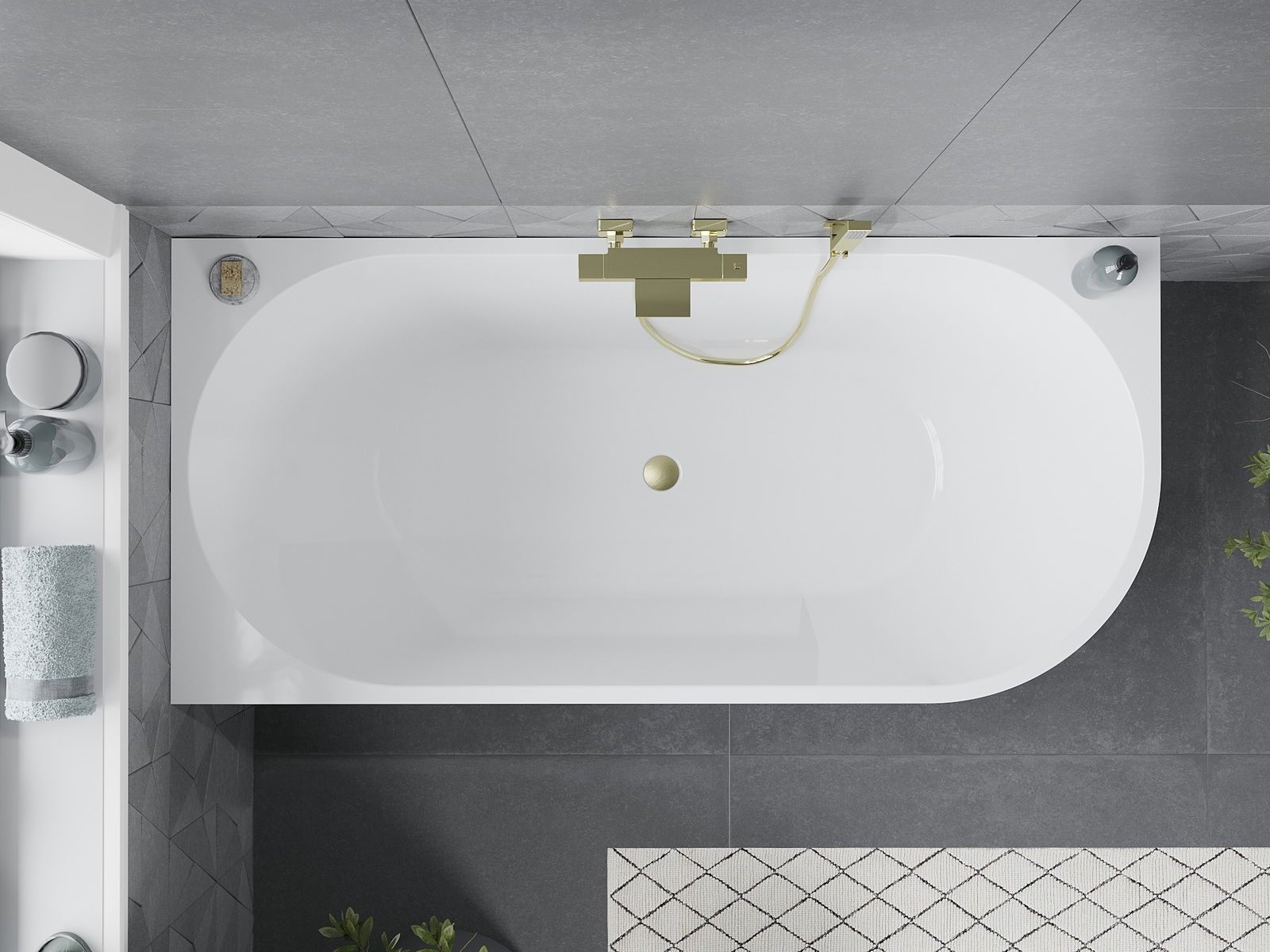 Voľne stojaca rohová vaňa, charakterizujúca sa elegantným bielym povrchom a zlatým kartáčovaným prepadom, sa dokonale hodí do moderných kúpeľňových dizajnov. V rozmeroch 170 x 80 cm a výške 58 cm, vyrobená zo sanitárneho akrylu, poskytuje nielen komfort, ale aj trvácnosť. Odolná voči matovaniu a UV žiareniu, je ľahká na údržbu. V súprave sa nachádza sifón a zátka klik klak, čo ju robí praktickou voľbou pre každý dom.