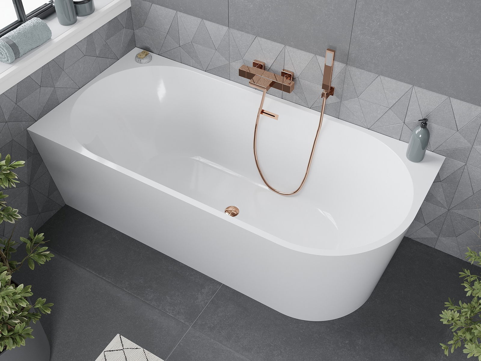 Voľne stojaca rohová vaňa sa vyznačuje moderným dizajnom v obdĺžnikovom tvare, ktorý sa dokonale hodí do každej kúpeľne. Jej veľkosť 170 x 80 cm a výška 58 cm zaisťujú komfortné používanie. Vyrobená zo sanitárneho akrylu, je odolná voči matovaniu a UV žiareniu, čo zaručuje dlhú životnosť. Efektná povrchová úprava v ružovom zlate a atraktívna biela farba ju robia elegantným prvkom interiéru. V sade sa nachádza sifón a zátka klik klak, čo uľahčuje montáž a používanie.