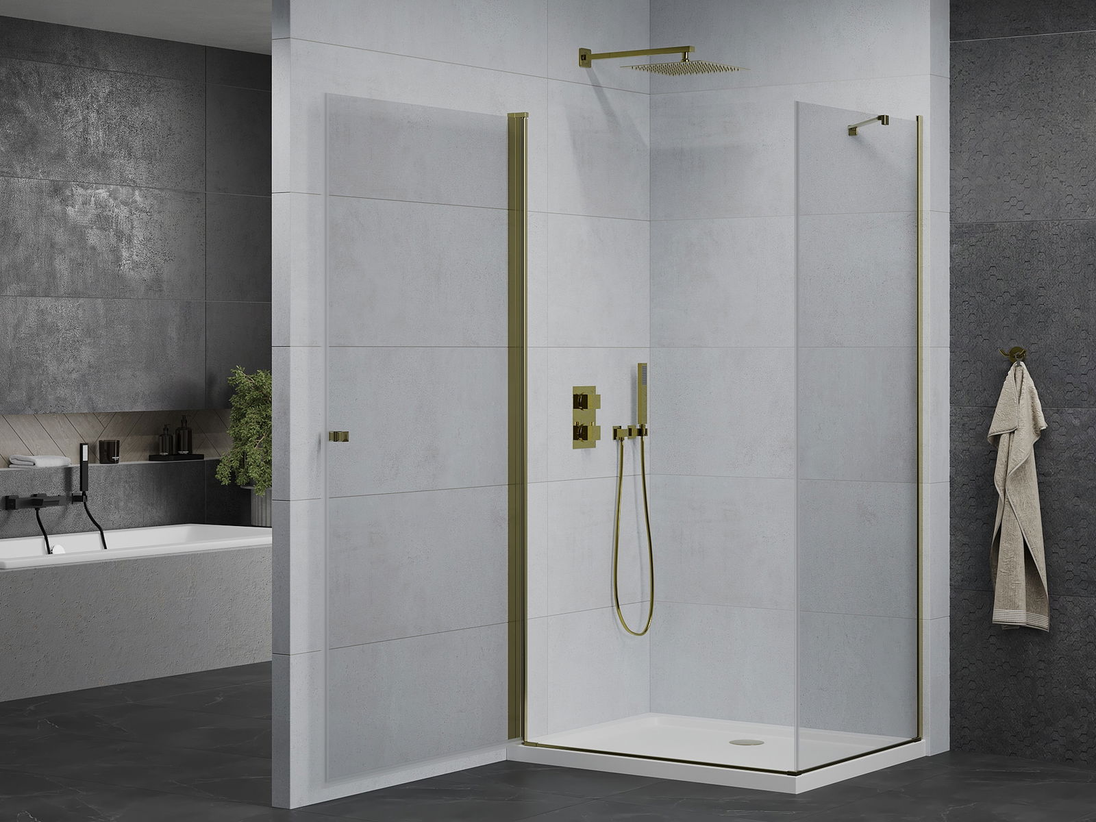 Mexen Pretoria závesný sprchový kút 90 x 80 cm, transparentný, zlatý + vanička Flat - 852-090-080-50-00-4010