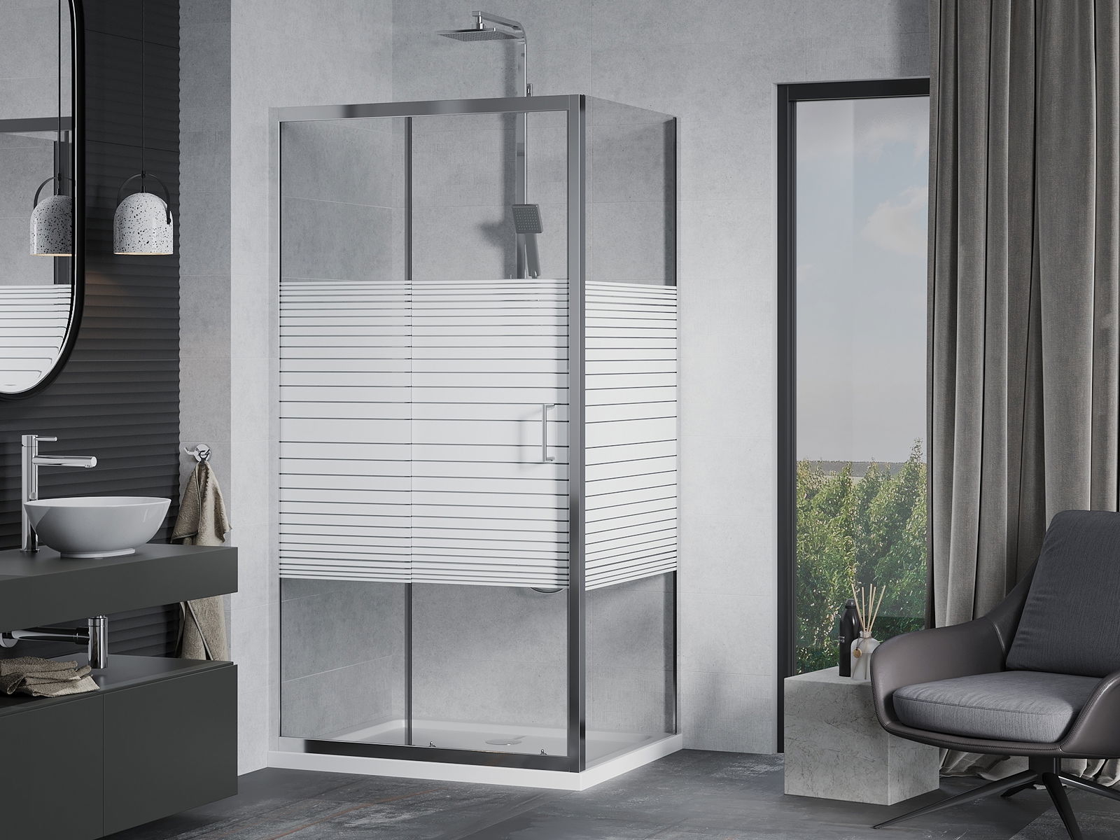 Praktická a pohodlná rukoväť je vyrobená z odolného a pevného kovu. Moderný tvar v kombinácii s povrchovou úpravou prispôsobenou farbe profilov dodáva celku moderný a štýlový vzhľad, zdôrazňujúc estetiku každej kúpeľne.