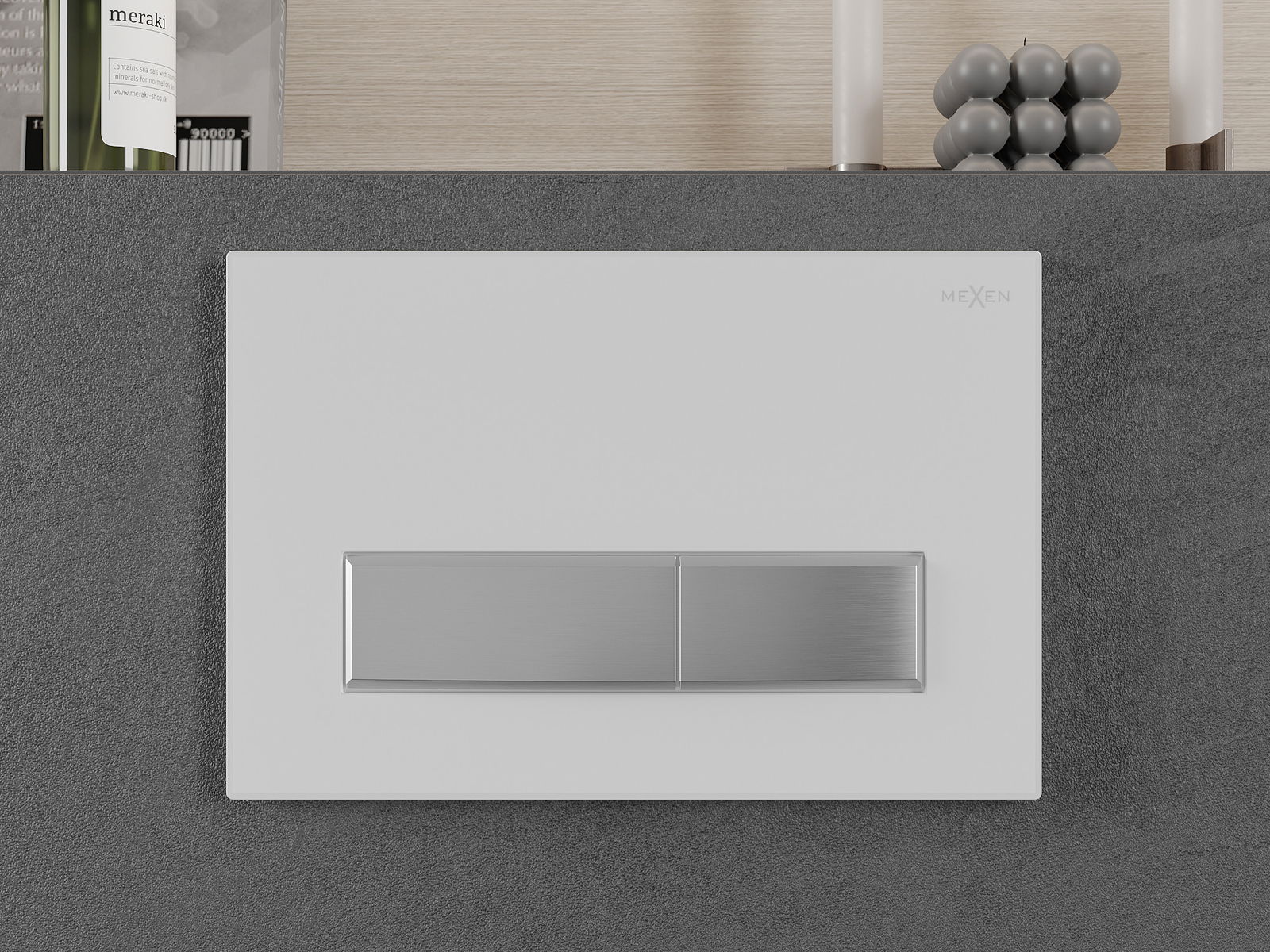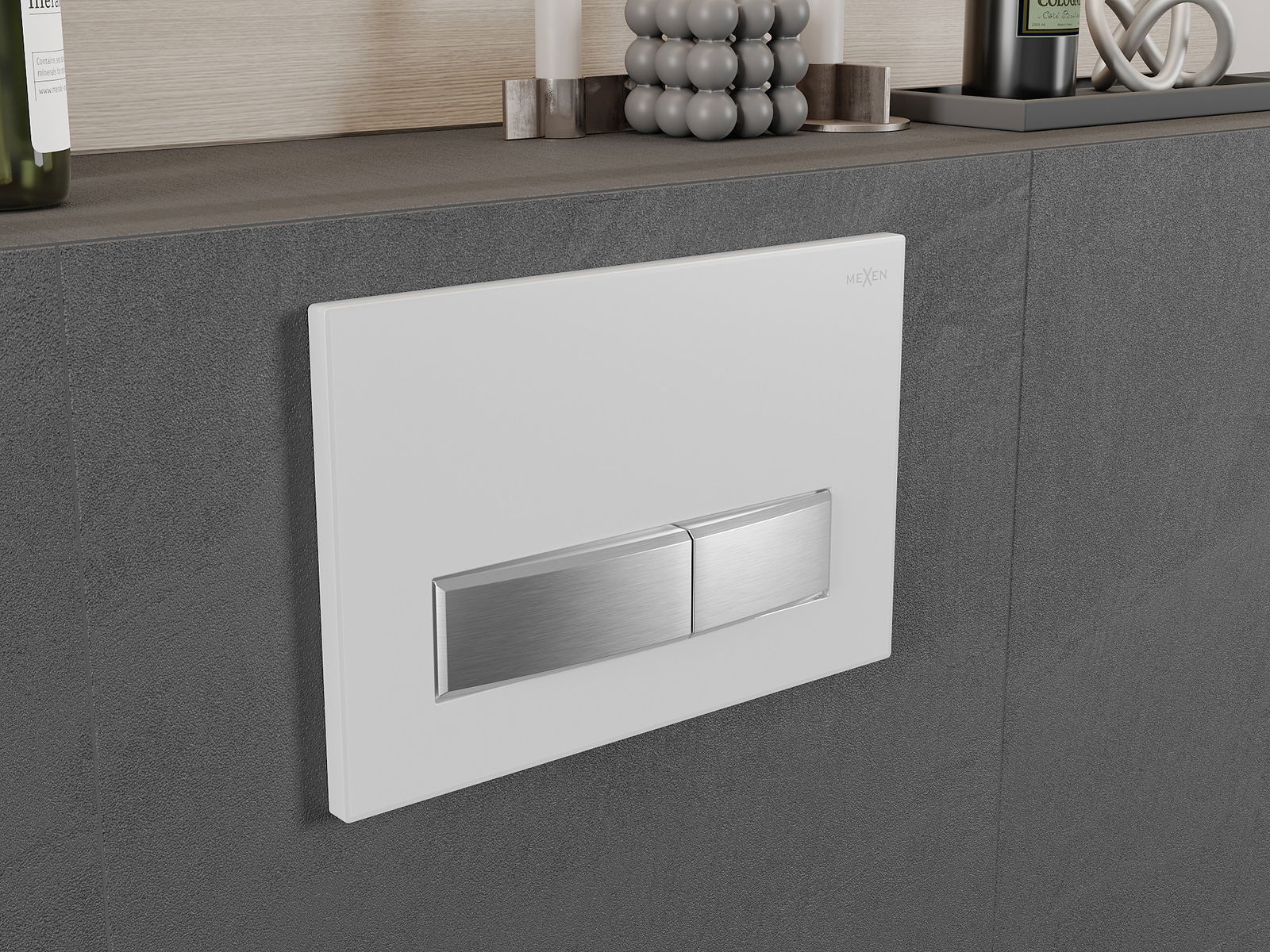 Tlačidlo sa zmestí na rám z Mexen Fenix Slim Series, v ktorej je možné nainštalovať spredu. Populárne a praktické riešenie, najmä v kúpeľniach, kde je prístup k gombíku spredu pohodlnejší.