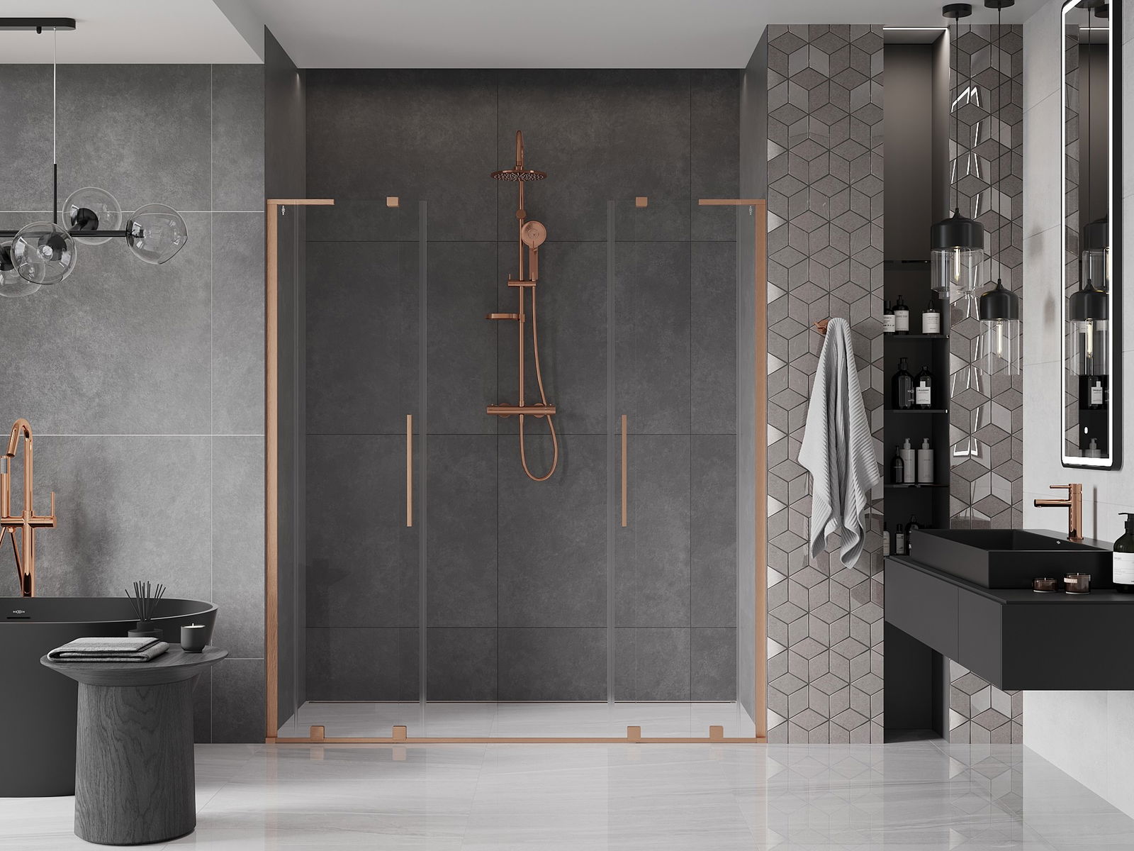 Mexen Velar L Duo posuvné sprchové dvere 180 cm, transparentné, brúsená meď - 871-180-003-02-65