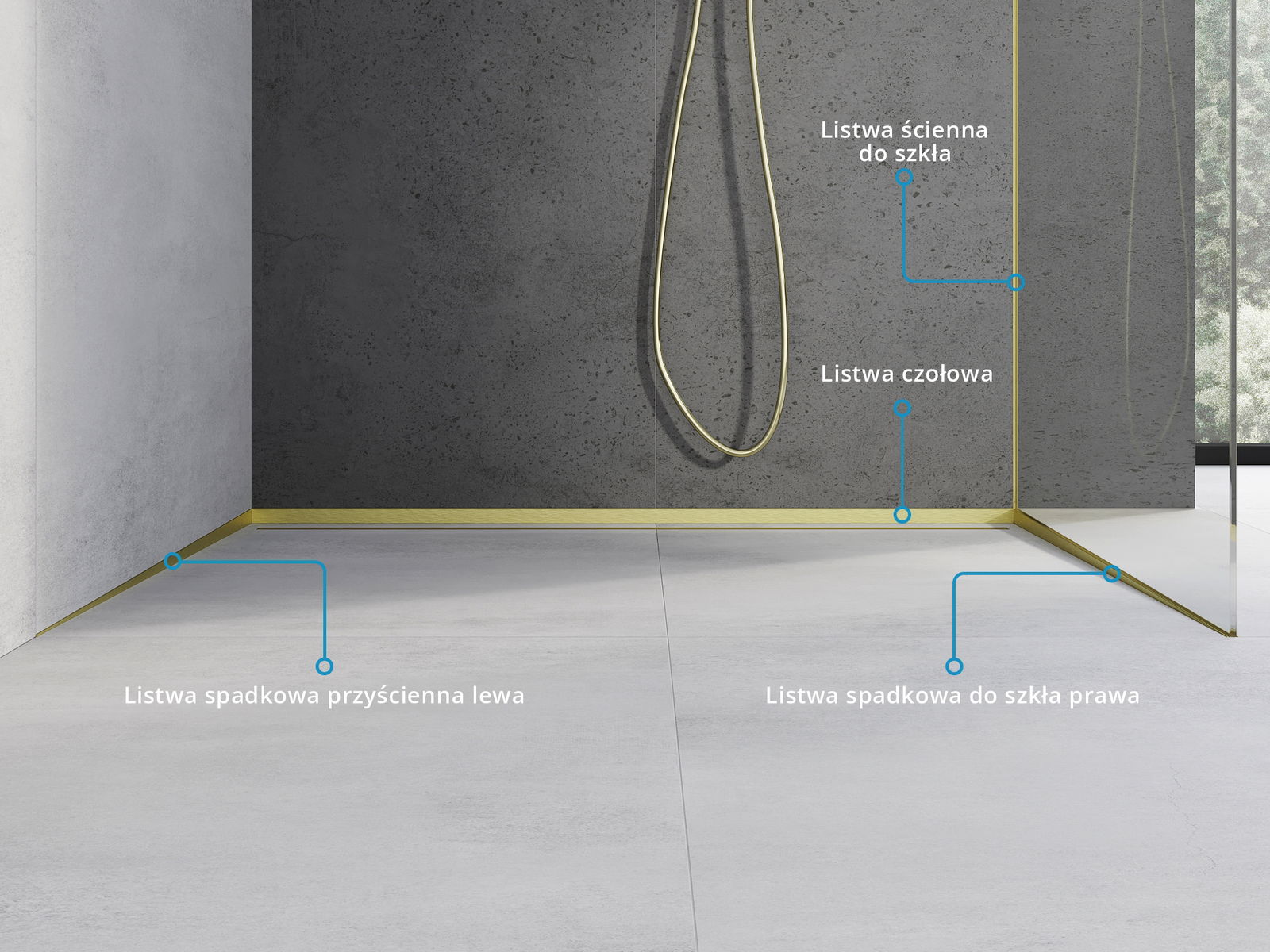 Čelná lišta je doplnkom pri použití sklonových líšt, vytvárajúcich súvislý celok v sprchovom priestore